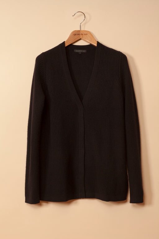 When you think about it, the cardigan is a sewn blazer redesigned and transformed in a knitted version. And this is exactly what ça va de soi does best: reinterprets a classic, makes it less rigid, more flexible and softer. With or without a collard, short, or long sleeves, zipped, belted, buttoned, longer or shorter, black, ivory or azure-blue, the cardigan is a must- in all its forms.
