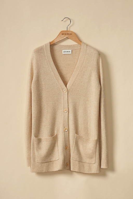 When you think about it, the cardigan is a sewn blazer redesigned and transformed in a knitted version. And this is exactly what ça va de soi does best: reinterprets a classic, makes it less rigid, more flexible and softer. With or without a collard, short, or long sleeves, zipped, belted, buttoned, longer or shorter, black, ivory or azure-blue, the cardigan is a must- in all its forms.