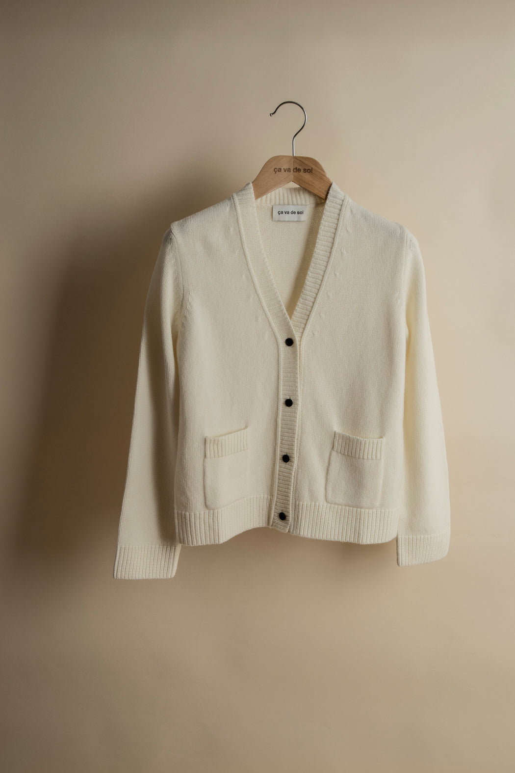 This cardigan has many aesthetic particularities. Its patch pockets are the couture touch of this "almost" suit, which is far from being just a simple warm piece of clothing. As for the 1x1 ribbing, they give it a hint of "handmade" knit, which we particularly like at ça va de soi for its artisanal appeal. The length of its bracelet sleeves affirms femininity, and the horn buttons gracefully close its edges, giving it a 'country' touch when you take it for a walk in nature. Comfort without compromising style. It is perfect with the Franconia and Hermione for an evening out, or with the Macao leggings to feel beautiful at home.