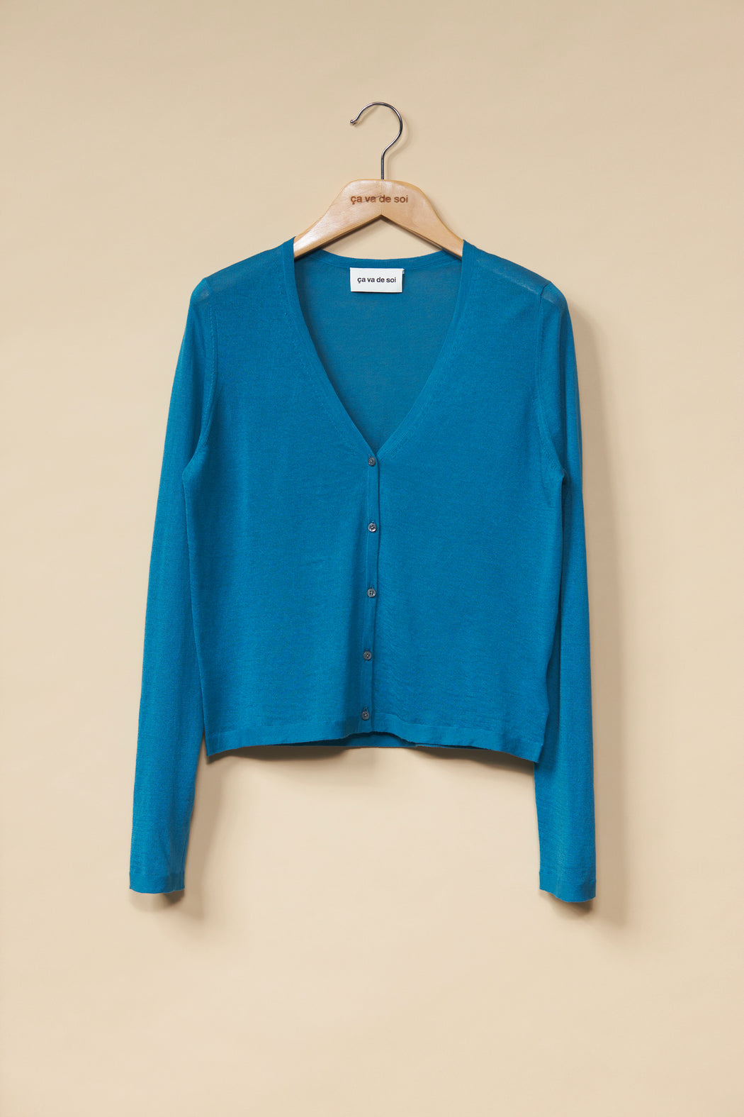 This lightweight cardigan is made of COM4-ZERO™ (thousand washes) Egyptian Mako cotton ELS - extra-long staples. It is knitted with a fine double thread in 16-gauge, which gives the look and feel of a slip on t-shirt. Fresh, delicate and sophisticated but with the fluidity and all the rich details and fully fashion needle réductions a knit has to offer. Just as elegant on jeans as on a party skirt. We produced this knit in 6 rich accent colors hank dyed by Italian masters.