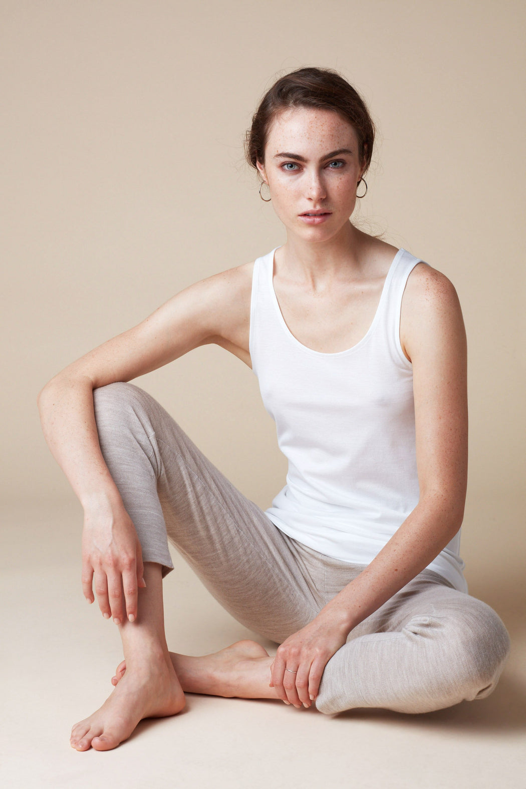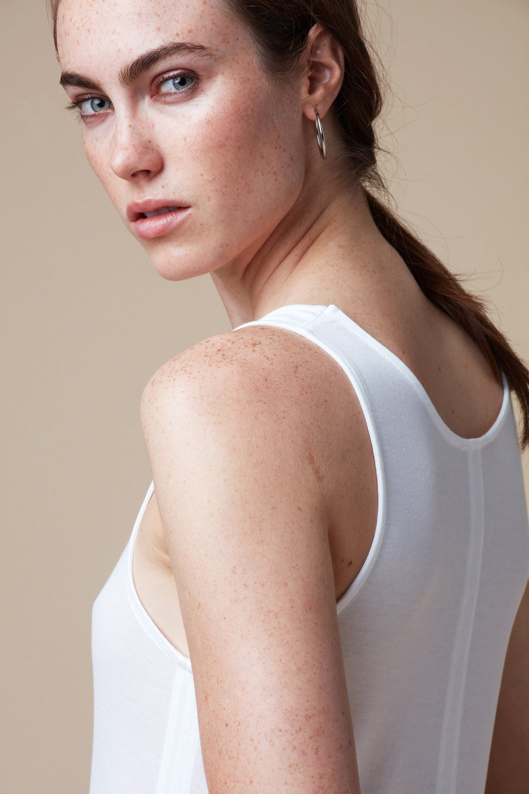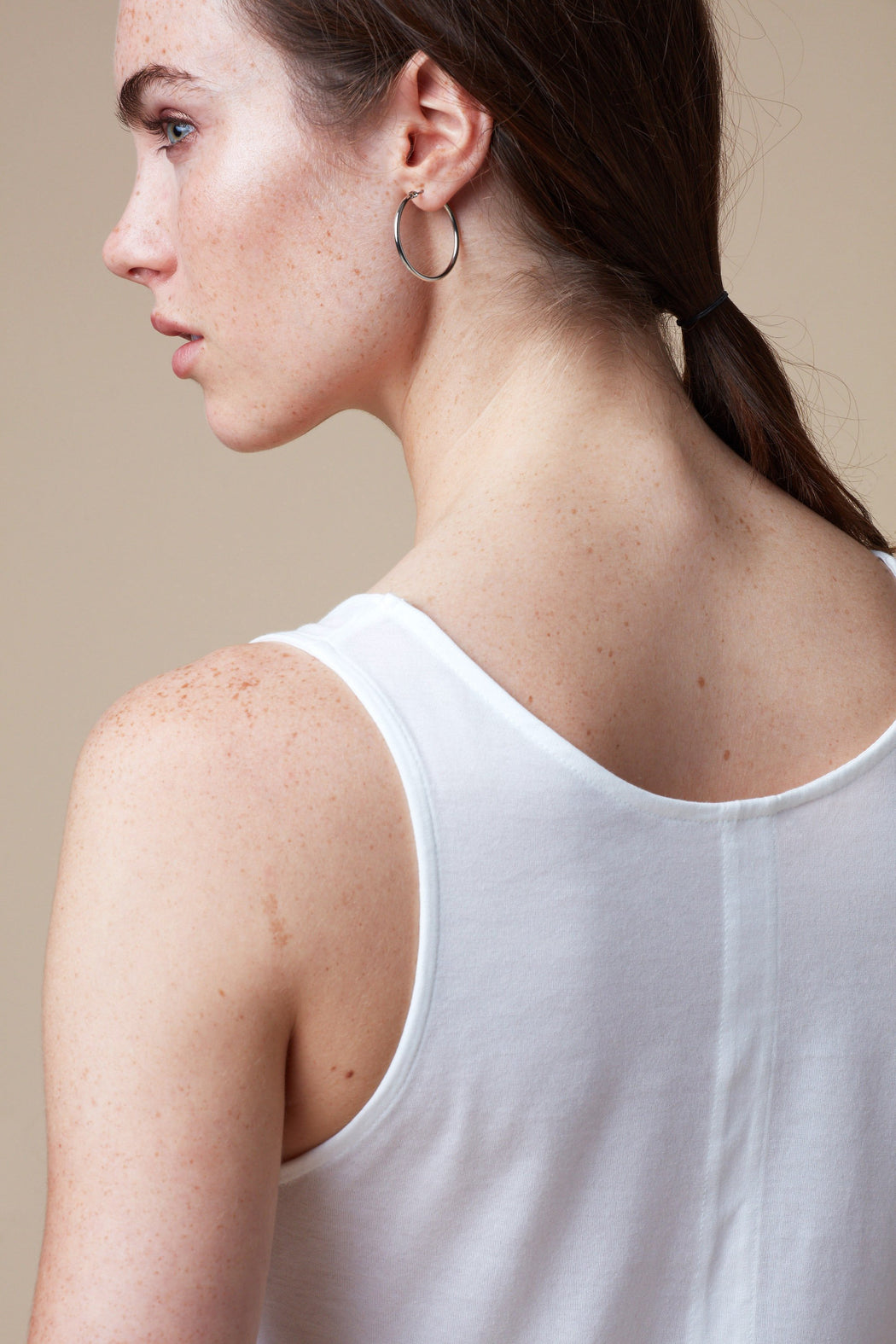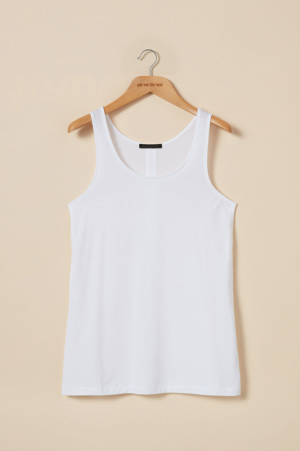 "Details make perfection, and perfection is not a detail," said Leonardo Da Vinci. Ça va de soi wanted to create a tank that brings a luxurious section of wearing a shirt under a sweater. Very couture in spirit, very flattering in its lengthened shape, the light, fluid jersey of this Karnak-Menoufi Egyptian cotton underpining is emphasized on the back by the detail evoking broadened French couture that brings refinement and style. Also note the seams covered using the same material, aiming to achieve the ultimate comfort! The collection includes three light shades and one Licorice black.