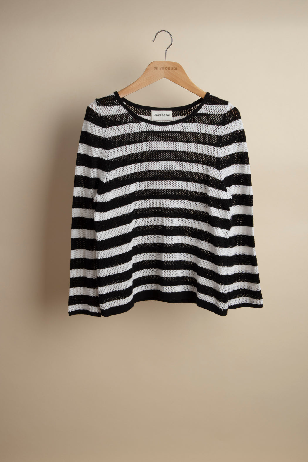 What better than a marinière for high summer dressing? Here, in this crochet iteration, it is a charming piece with careful details: bracelet length sleeves, a lovely round neck, and with a tubular finish at the wrists and waist that highlight its refined design.
