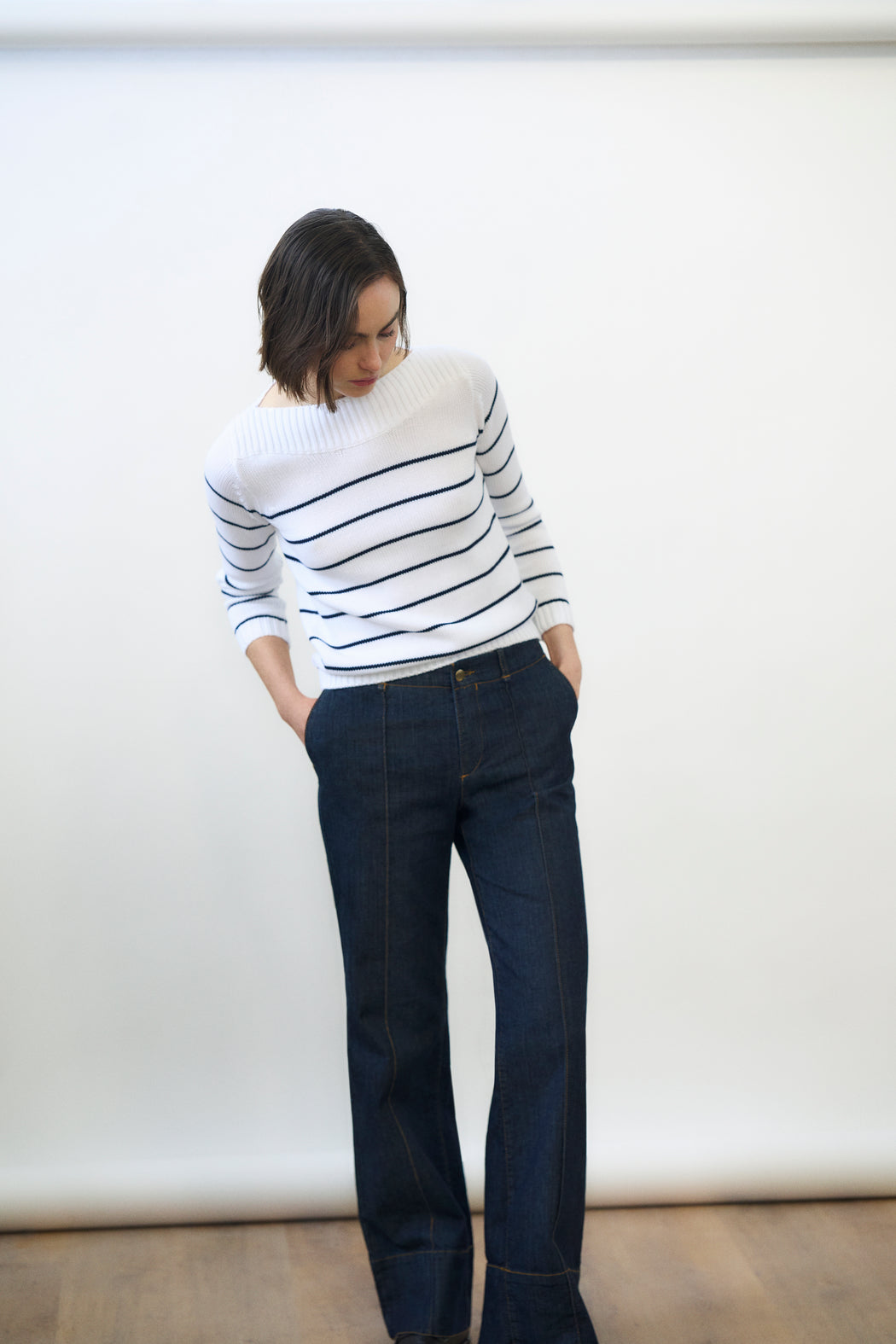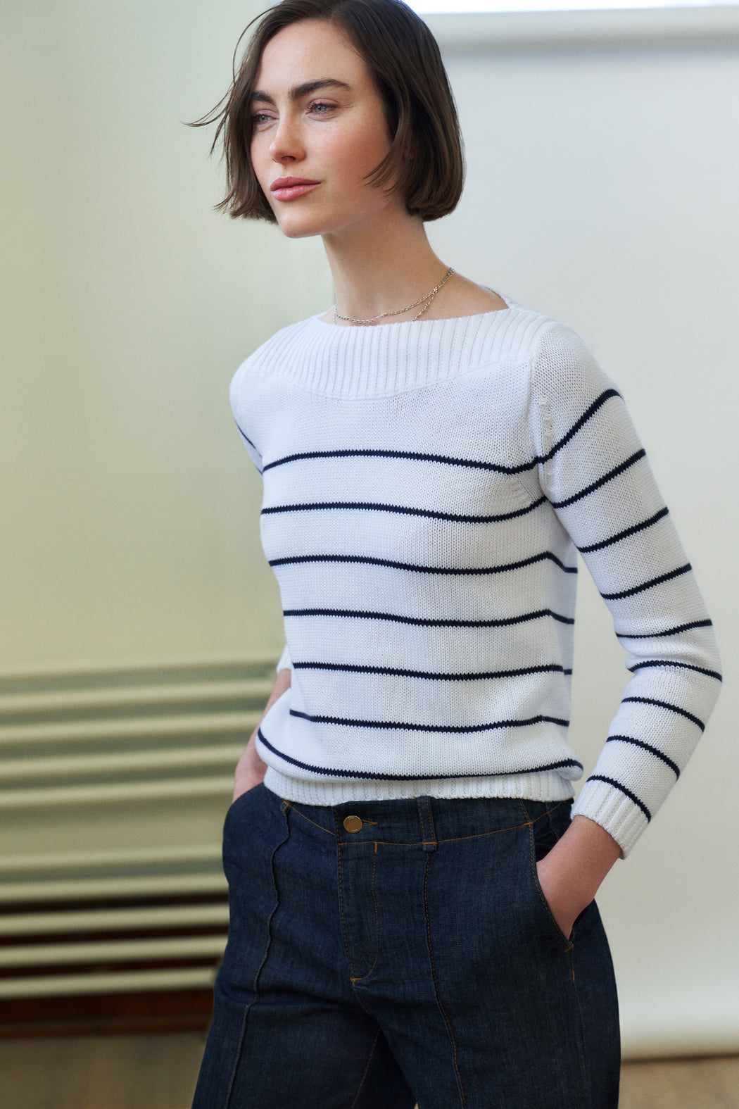 Ideal with flared or Marino trousers, or even loose jeans for a more sporty silhouette. Available in solid colors or striped like a sailor shirt, offering more options for more style!