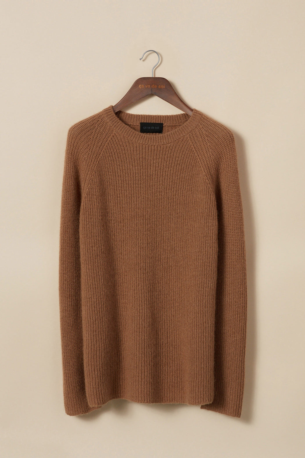 This raglan sweater is a tribute to playwright Arthur Miller, Marilyn Monroe’s last husband. It embodies the sweater in its most basic form and essence. We can’t live without it. It’s the first item thrown in our weekend bag, and the one we grab from our boyfriend because we love it so much. Made from camel wool, a soft, lightweight fibre known for its thermoregulating properties, this basic retains its iconic sportswear appeal with its raglan armhole. Its shape has been softened, infused with more flow than its masculine counterpart. Its ribbed border has been removed to bring greater movement and dynamic appeal. ça va de soi has chosen to preserve the camel fibre in its natural shade.