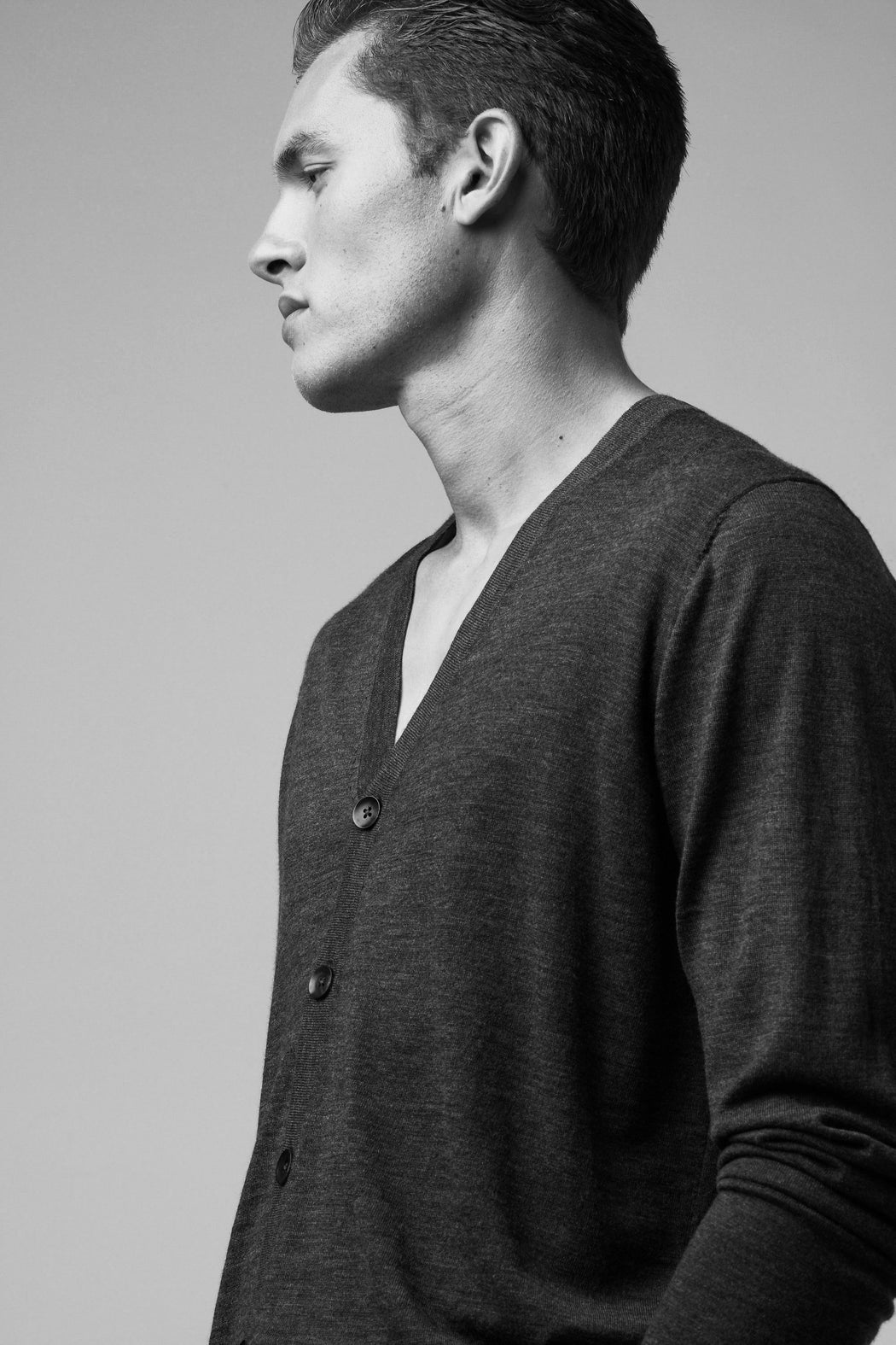 Perhaps even more than the sweater, the V-neck cardigan may bring a ultra-charming casual elegance to your everyday wear. Featuring five distinctive curved buttons in natural horn, this extra-fine merino wool knit inspired by the icons of the 1960s pairs perfectly with chino and denim. Our collection is available in two subtly complex, rich heathered shades - Camel and Anthracite. It also comes in our Absolute black and Sapphire.