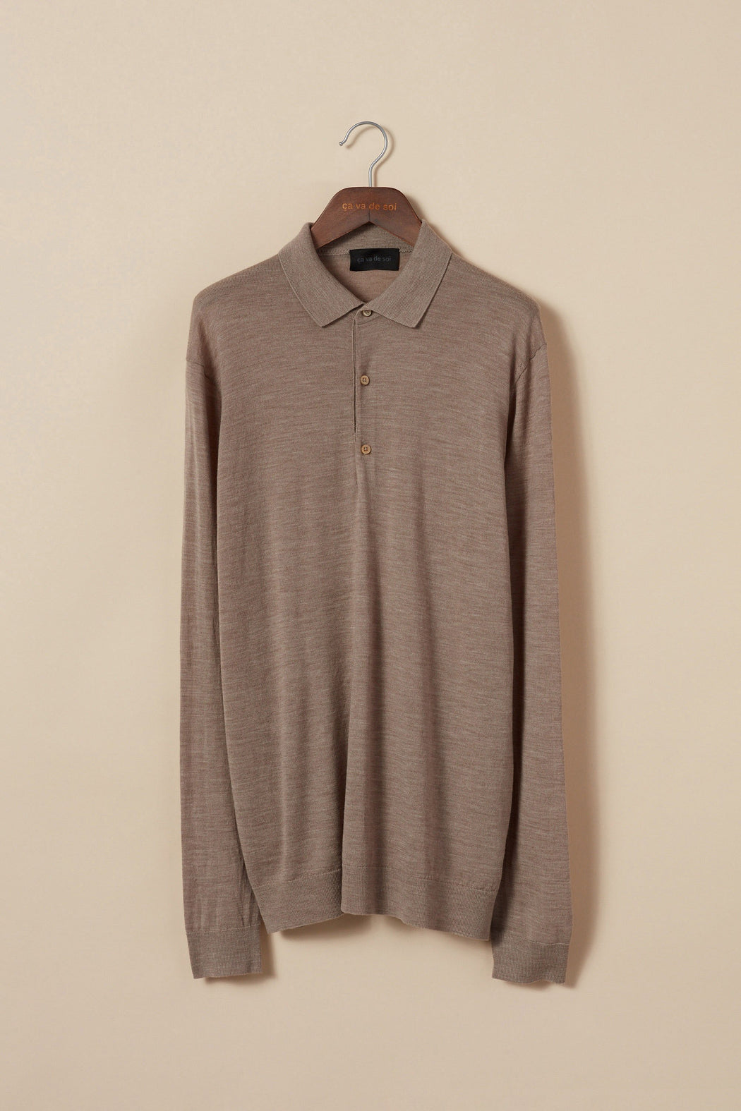 With its scooped neckline studded with mother-of-pearl buttons, straight cut and long sleeves, our extra-fine merino wool polo shirt can easily play the role of the shirt. 1960s-inspired, this fashion icon is profoundly redefined through its circular knit. It also rethinks the way it is worn, year long. Light, it can be worn alone or over a T-shirt. Naturally. Our collection is available in two subtly complex, rich heathered shades - Camel and Anthracite. It also comes in our Absolute black and Sapphire.