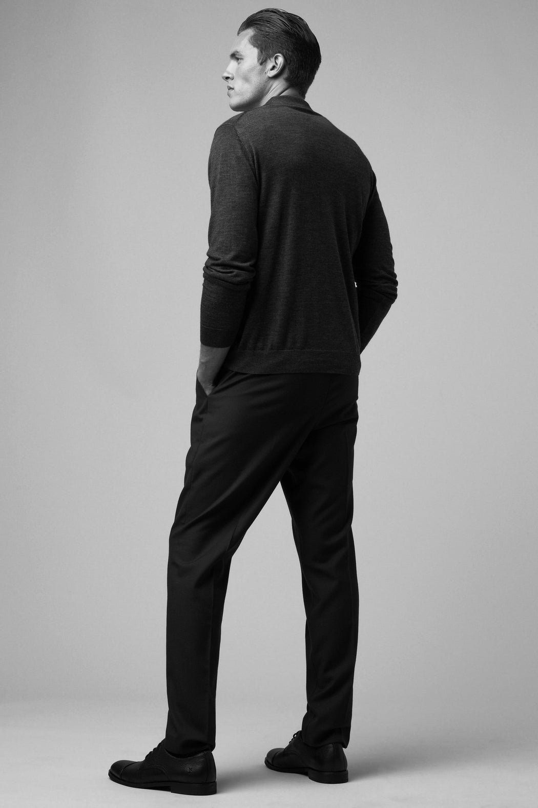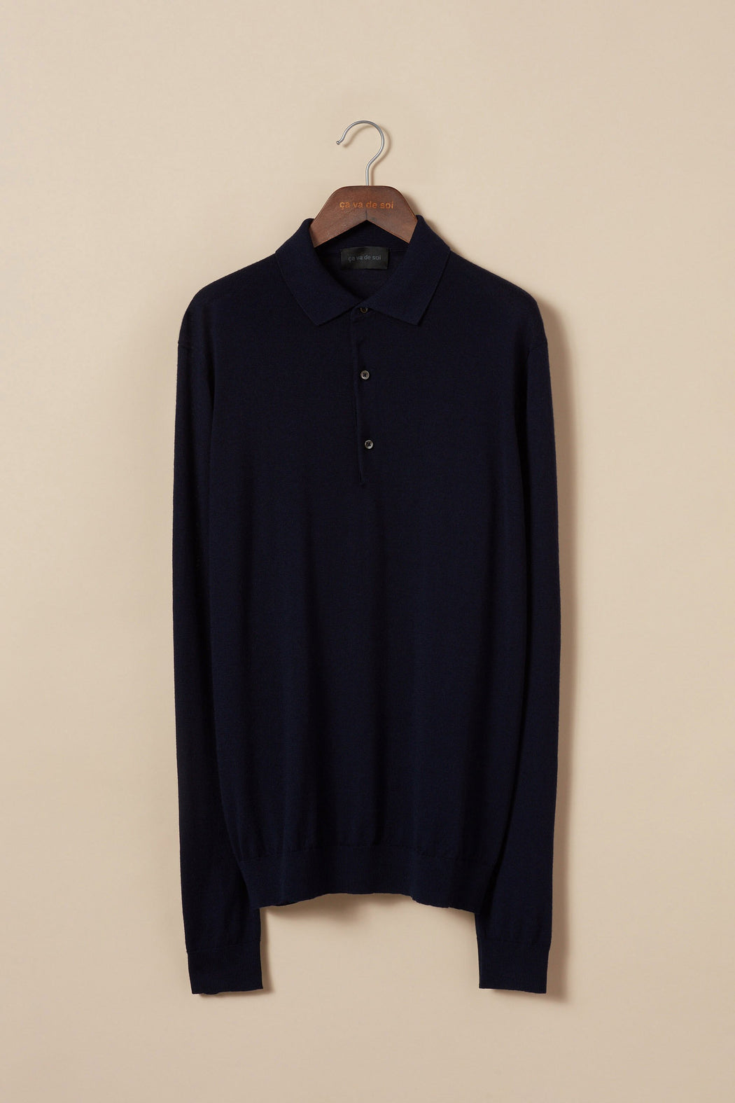 With its scooped neckline studded with mother-of-pearl buttons, straight cut and long sleeves, our extra-fine merino wool polo shirt can easily play the role of the shirt. 1960s-inspired, this fashion icon is profoundly redefined through its circular knit. It also rethinks the way it is worn, year long. Light, it can be worn alone or over a T-shirt. Naturally. Our collection is available in two subtly complex, rich heathered shades - Camel and Anthracite. It also comes in our Absolute black and Sapphire.