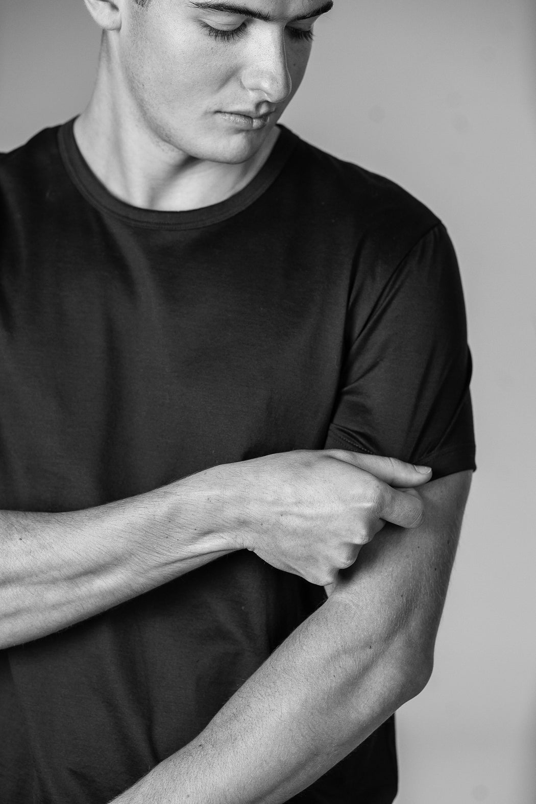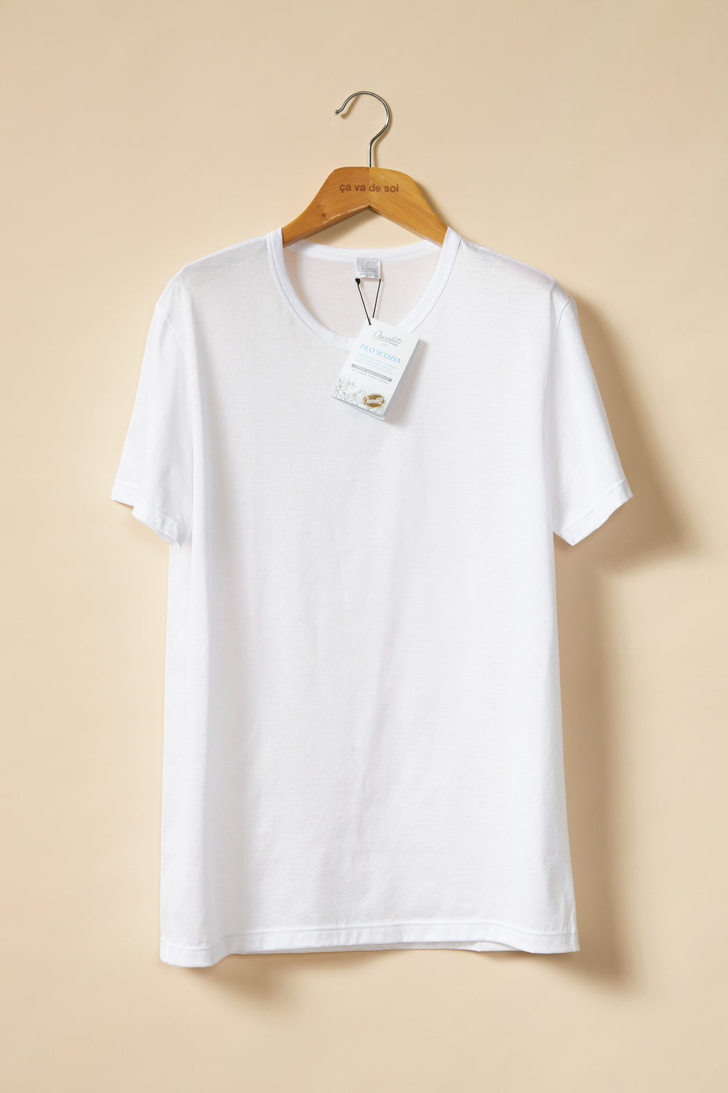 This men’s t-shirt is a pure classic from Oscalito. The historical circular knitting machines used to knit this product operate at lower speeds which results is a unique fabric of pure Egyptian Mako mercerized cotton, that offers long-lasting memory. The mercerized cotton used to make this garment, is also known as Lisle Cotton (Filoscozia®). Filoscozia® calls for softness with a silky texture, and is known for its hypoallergenic properties and a fresh feel on the skin. ça va de soi chose this second-skin essential for its classic appeal, its durability and refined make. Available in navy and white.