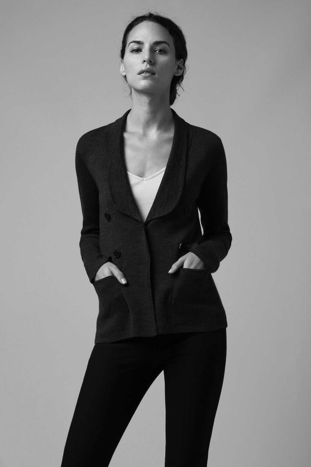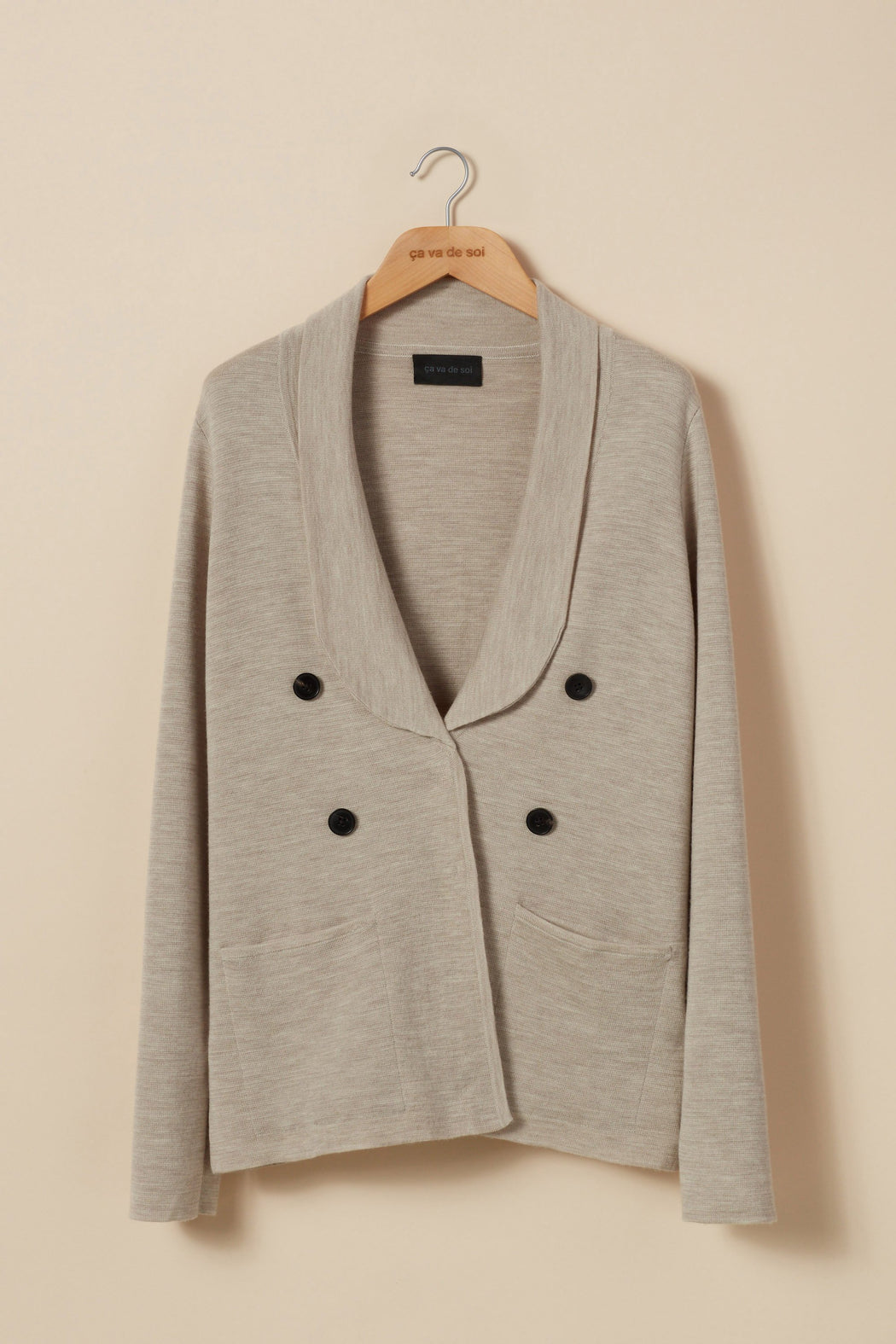 Made from 100% extra-fine ZQUE merino wool, this blazer is a knitted interpretation of the iconic nautical jacket. Featuring a double-breast buttoning with horn buttons, a push-button system that closes with confidence, a tuxedo collar and inserted pockets, it is the perfect casual. This faux double-breasted jacket, designed to last, is available in black and three classic heathered shades - Millet, Ink and Anthracite – composed of a rich spectrum of almost imperceptible shades giving the colour amazing depth.