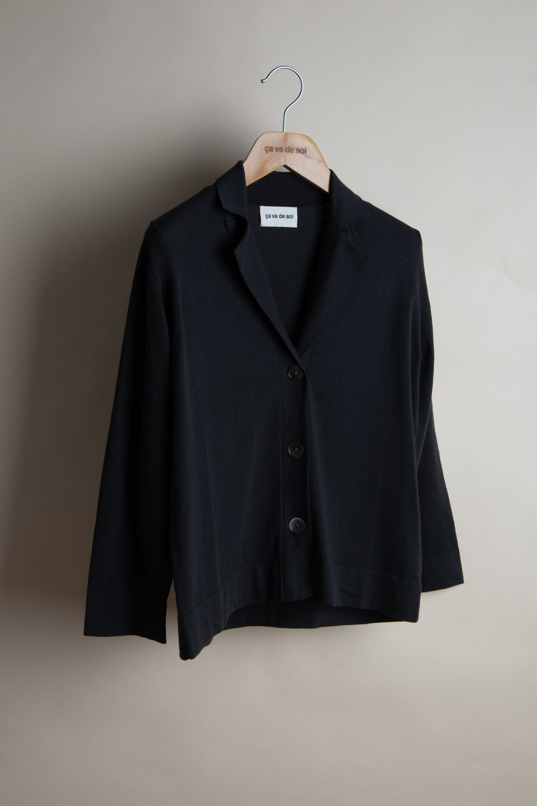The sartorial effect replayed in knitwear: ça va de soi is proud to have made it one of its specialties. Knitted vests with tailored necklines instantly provide the comfort of bespoke clothing, thanks to the flexibility of the jersey and its needle reductions. The result is elegance and sophistication without compromising comfort. Wear it as a suit or over a dress, and why not over your favorite skirt or pair of pants.