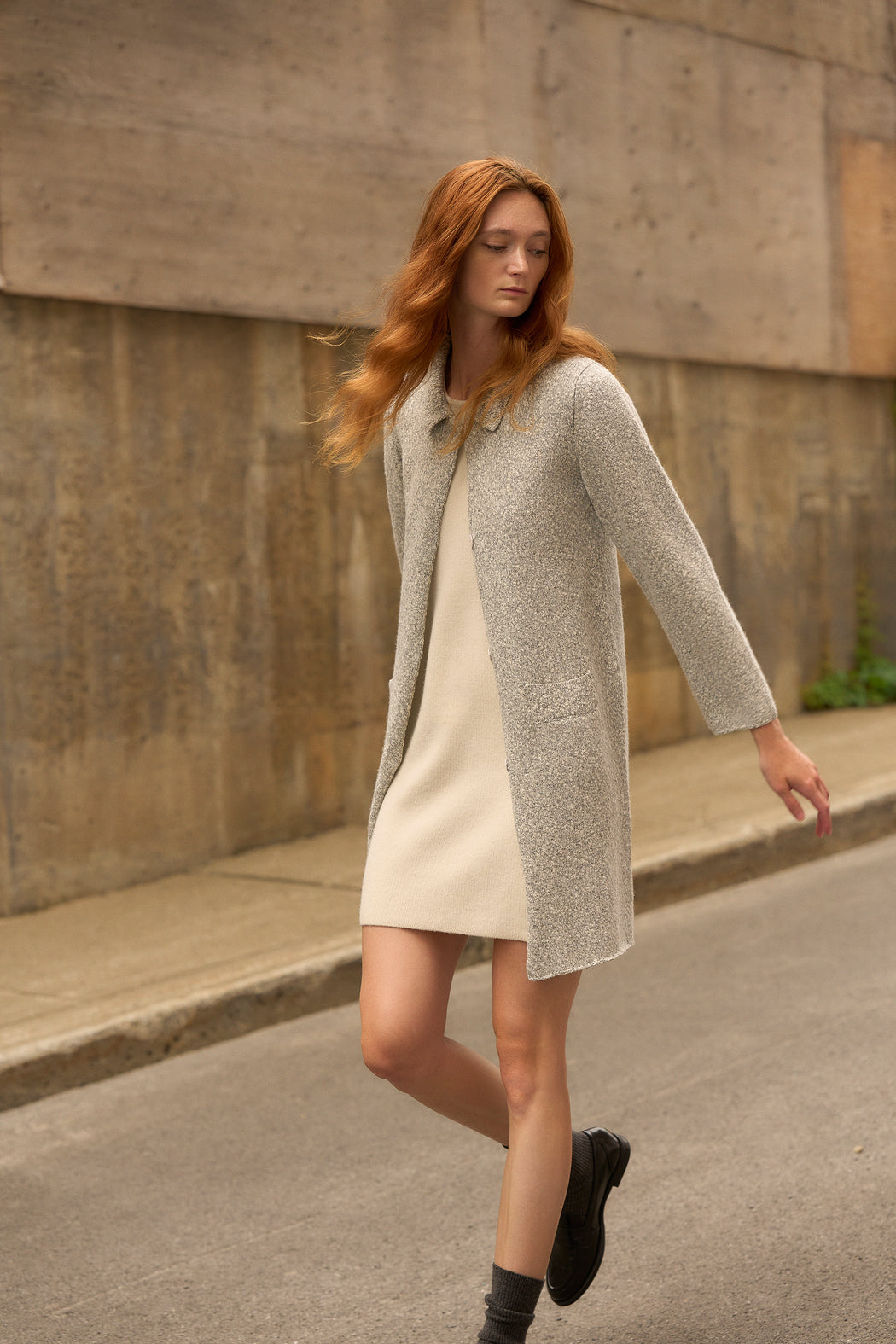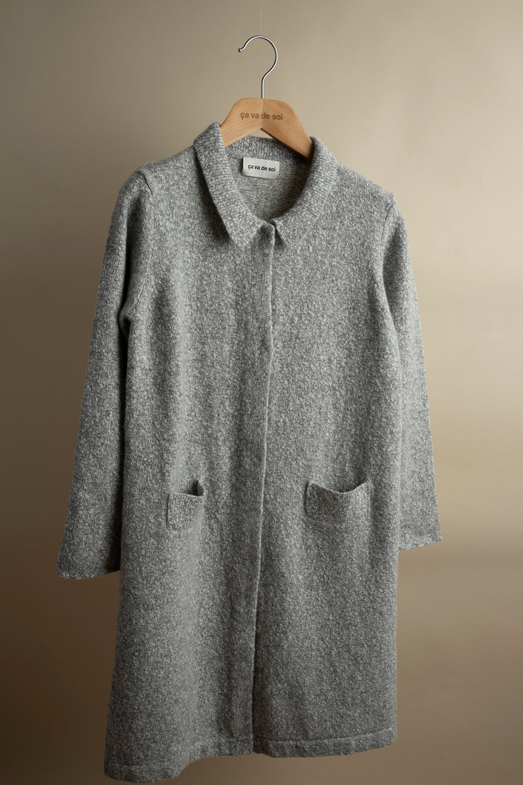 This timeless chic coat is inspired by the 1960s. Its charming ribbed collar, it’s placket framed with reverse tubular jersey and discreet snap buttons give it a modern touch. Hem and sleeve finishes are highlighted with a scalloped stitch, evoking artisanal, hand-embroidered knitwork.