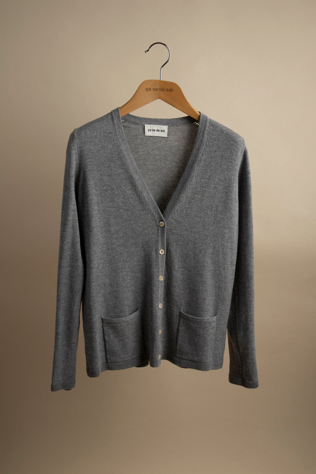 With pure, modern lines, this cardigan has a timeless appeal, elevated with feminine details through its V-neckline and slightly fitted cut. Two patch pockets finished with tubular jersey trim and small mother-of-pearl buttons add refined touches. Pair it with our couture T-shirt AGATHA for an elegant, classic twin-set.