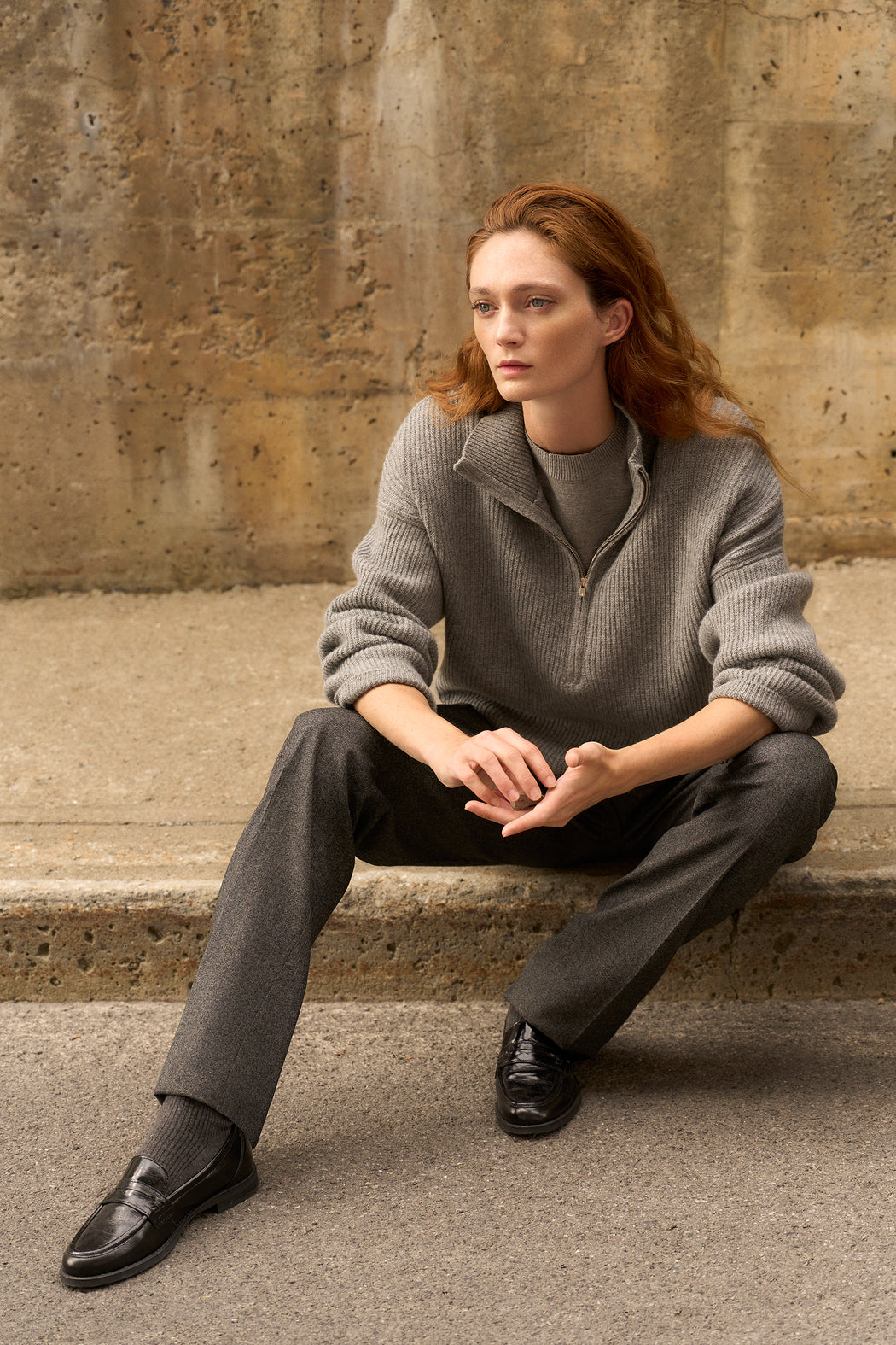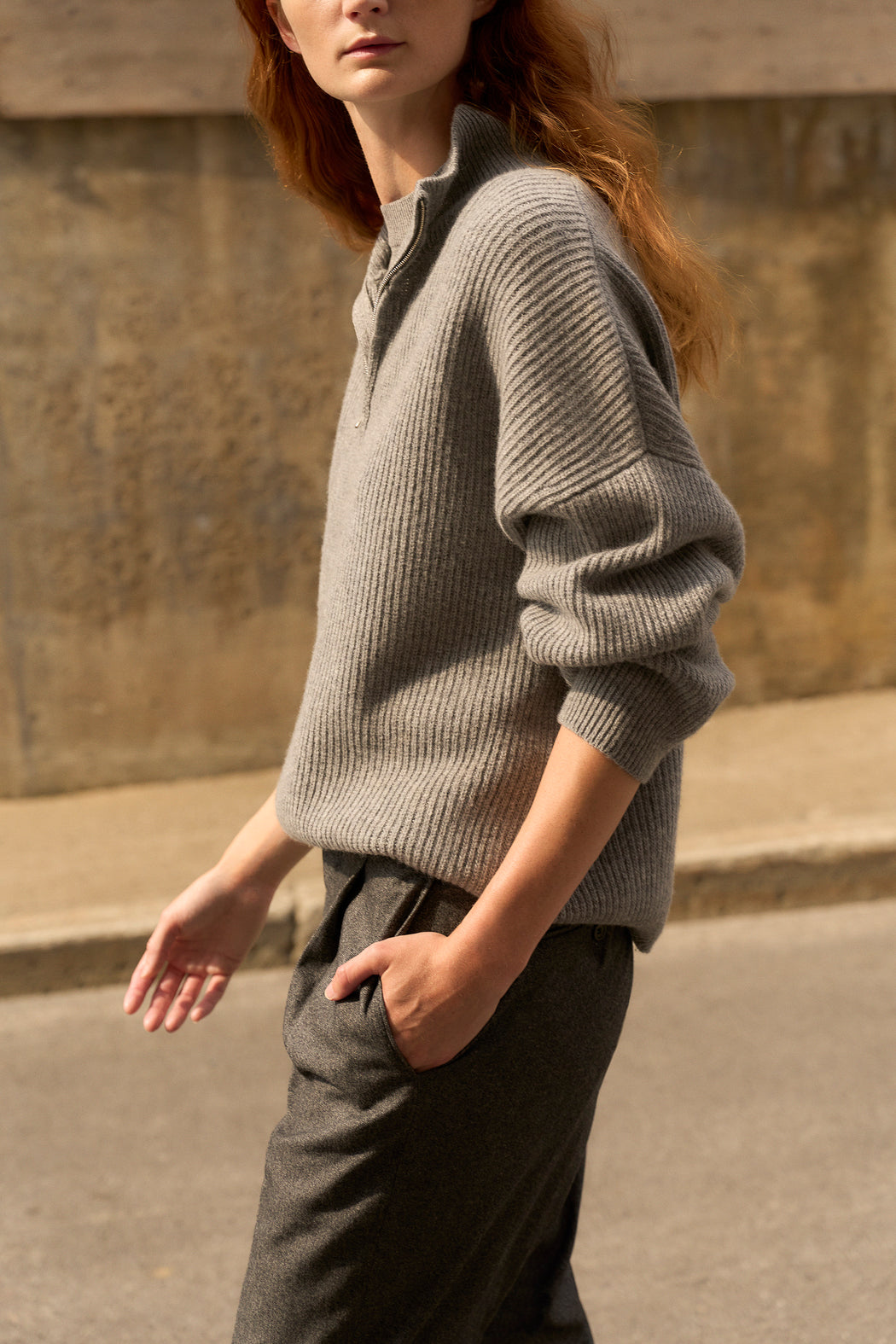 Ultra-contemporary, this sweater with its instantly recognizable style appeals to all generations. Both cool and practical, with its half-zip and stand collar, it is equally comforting with its straight fit, half fisherman’s rib texture, and offset armholes. Ease and warmth guaranteed.