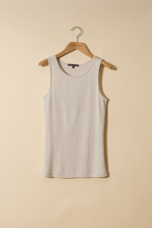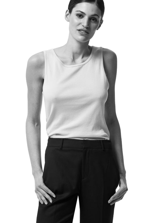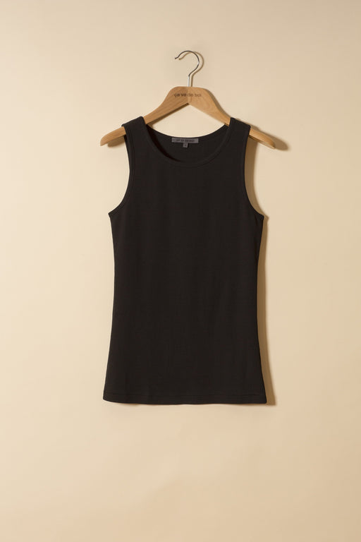 Neither the stitched jersey camisole nor the cami with fine straps, the sleeveless top was initially designed to to work with a cardigan, but wearing alone gave it a lingerie feel. ça va de soi takes the garment to new heights, new possibilities, crafting it with a rounded neckline, a V-neck, a high collar, even turtle-neck, in an ultra-short or classic version. In its cold weather version, it takes the form of a smart vest or perfect tank top.