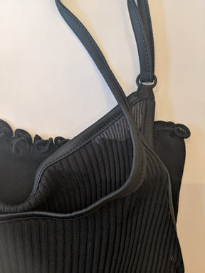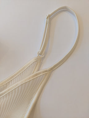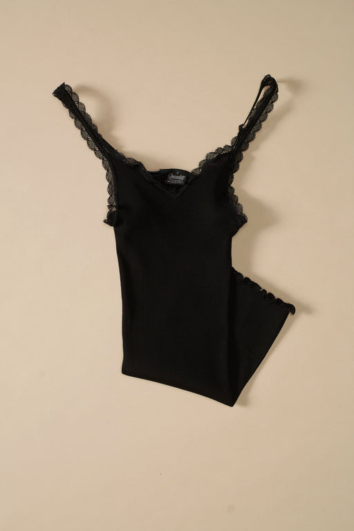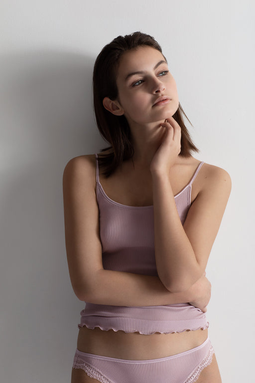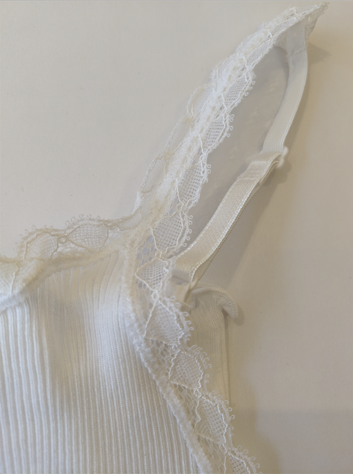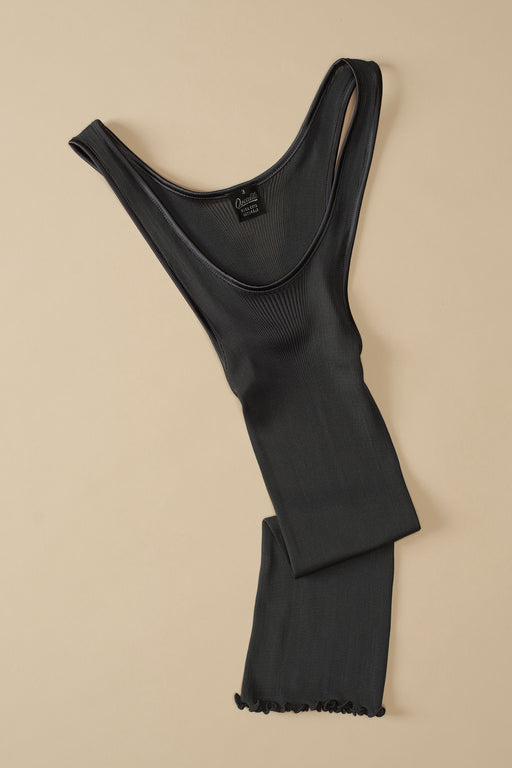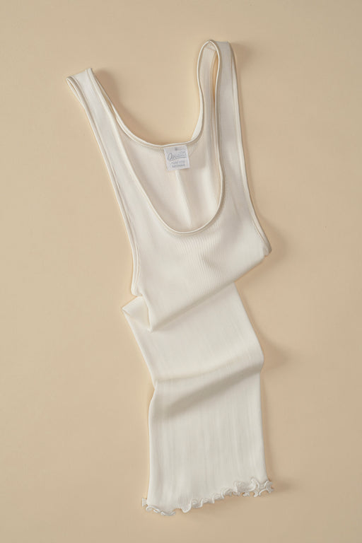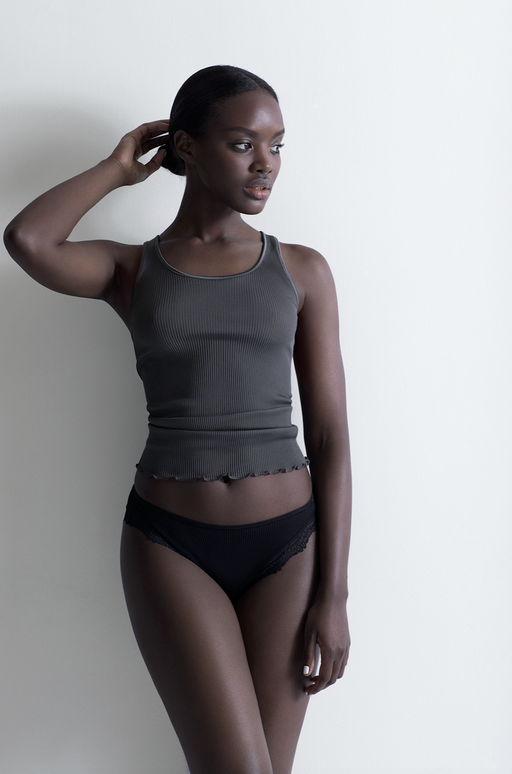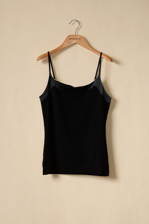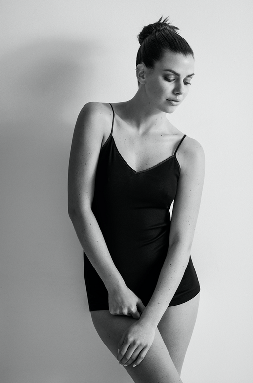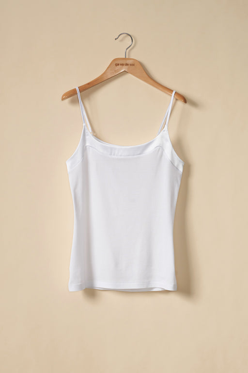 Neither the stitched jersey camisole nor the cami with fine straps, the sleeveless top was initially designed to to work with a cardigan, but wearing alone gave it a lingerie feel. ça va de soi takes the garment to new heights, new possibilities, crafting it with a rounded neckline, a V-neck, a high collar, even turtle-neck, in an ultra-short or classic version. In its cold weather version, it takes the form of a smart vest or perfect tank top.