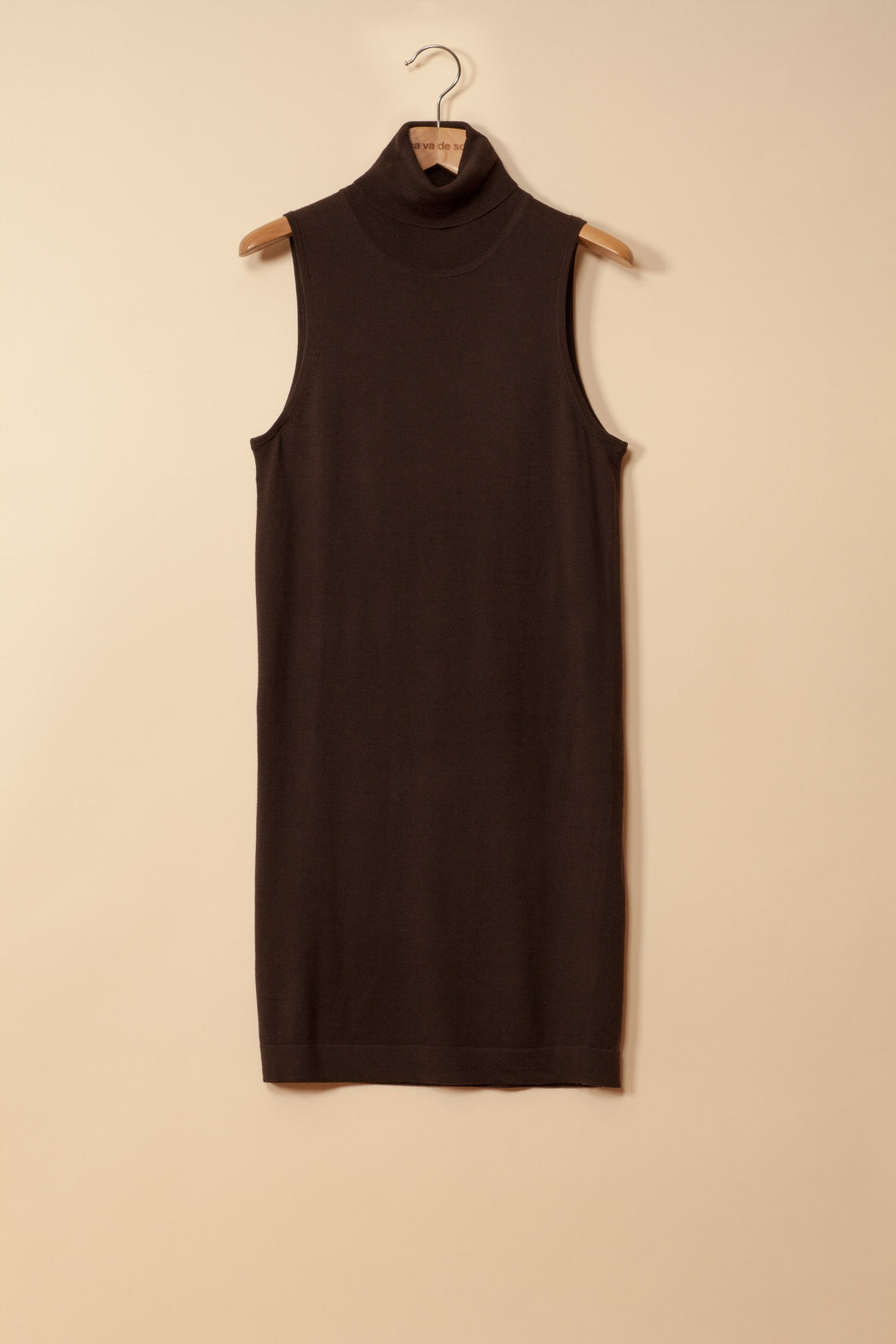 A turtleneck dress that is sleeveless is a sensual piece, one that represents a certain duality that is simply charming. A must have to anyone who loves her arms. This knitted tunic-dress is made of a rare highly coveted 15.5 micron Australian wool. This ultra-long staple fibre is enhanced by a finishing technique exclusive to Italy, resulting in a flawless, even finish. Thanks to its temperature-regulating properties, Super 160 merino wool can be worn next to the skin in any season for sheer elegance and comfort.