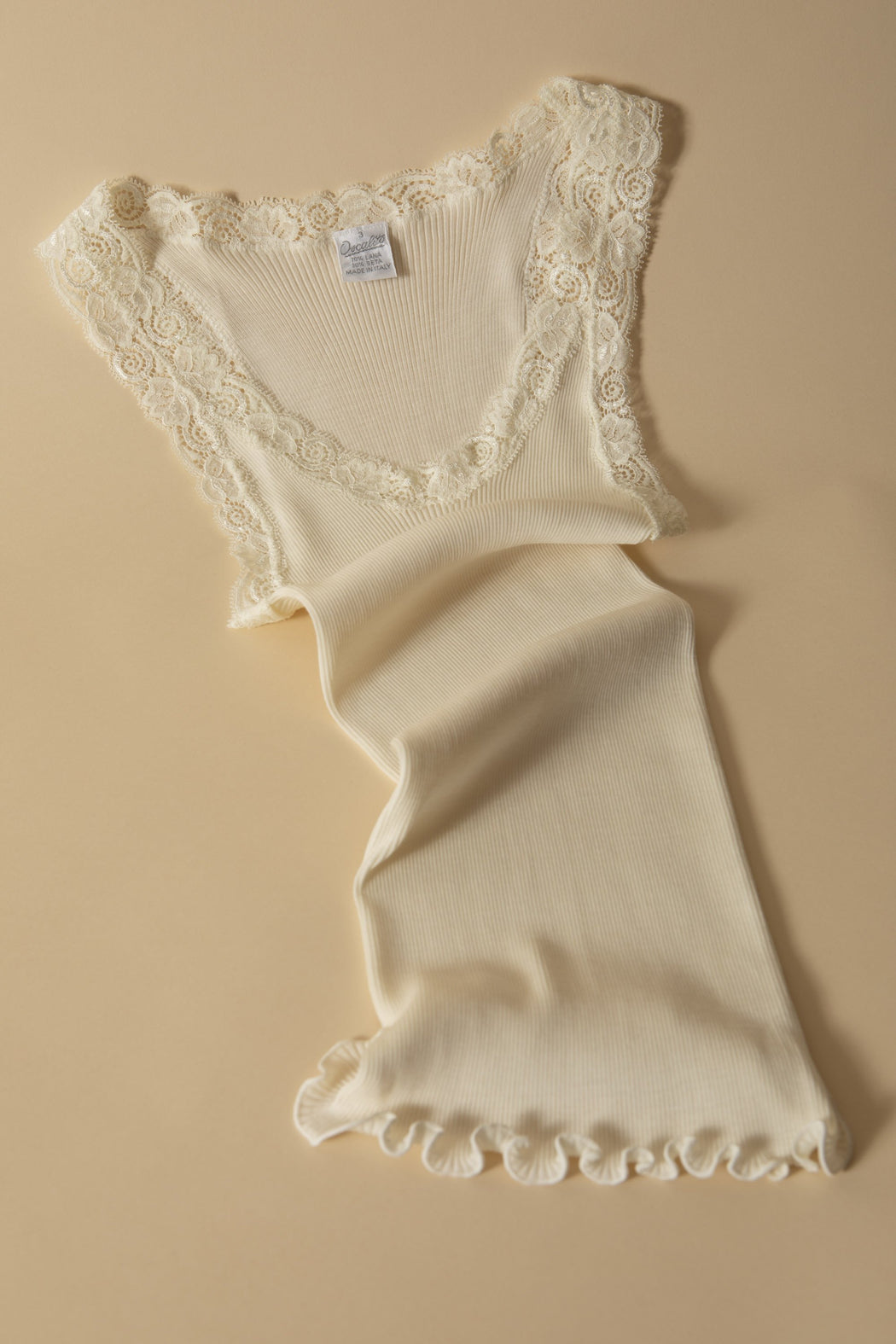 This precious tank top is like a jewel with all its Calais lace finishing around the neck and shoulders. Lovely will add a feminine touch to your outfits. Made with an intimate blend of extra-fine merinos and silk for warmth and coziness, its seamless ribbed tubular knitting serves as natural elasticity, adapting to the movements of your body, becoming a second skin. The Calais lace finish contributes to its fantasy and feminity. Discover this knit to enjoy a warm, comfortable winter in elegance and refinement. Entirely made in Italy in the pure European tradition of the art of wearing woolen lingerie. Colors available are champagne, and black.