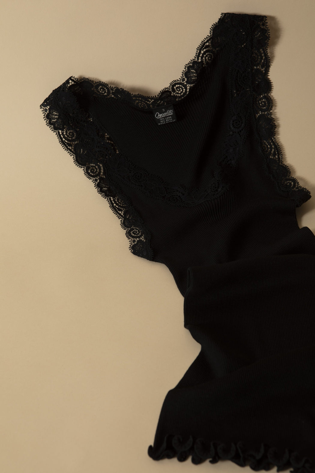 This precious tank top is like a jewel with all its Calais lace finishing around the neck and shoulders. Lovely will add a feminine touch to your outfits. Made with an intimate blend of extra-fine merinos and silk for warmth and coziness, its seamless ribbed tubular knitting serves as natural elasticity, adapting to the movements of your body, becoming a second skin. The Calais lace finish contributes to its fantasy and feminity. Discover this knit to enjoy a warm, comfortable winter in elegance and refinement. Entirely made in Italy in the pure European tradition of the art of wearing woolen lingerie. Colors available are champagne, and black.