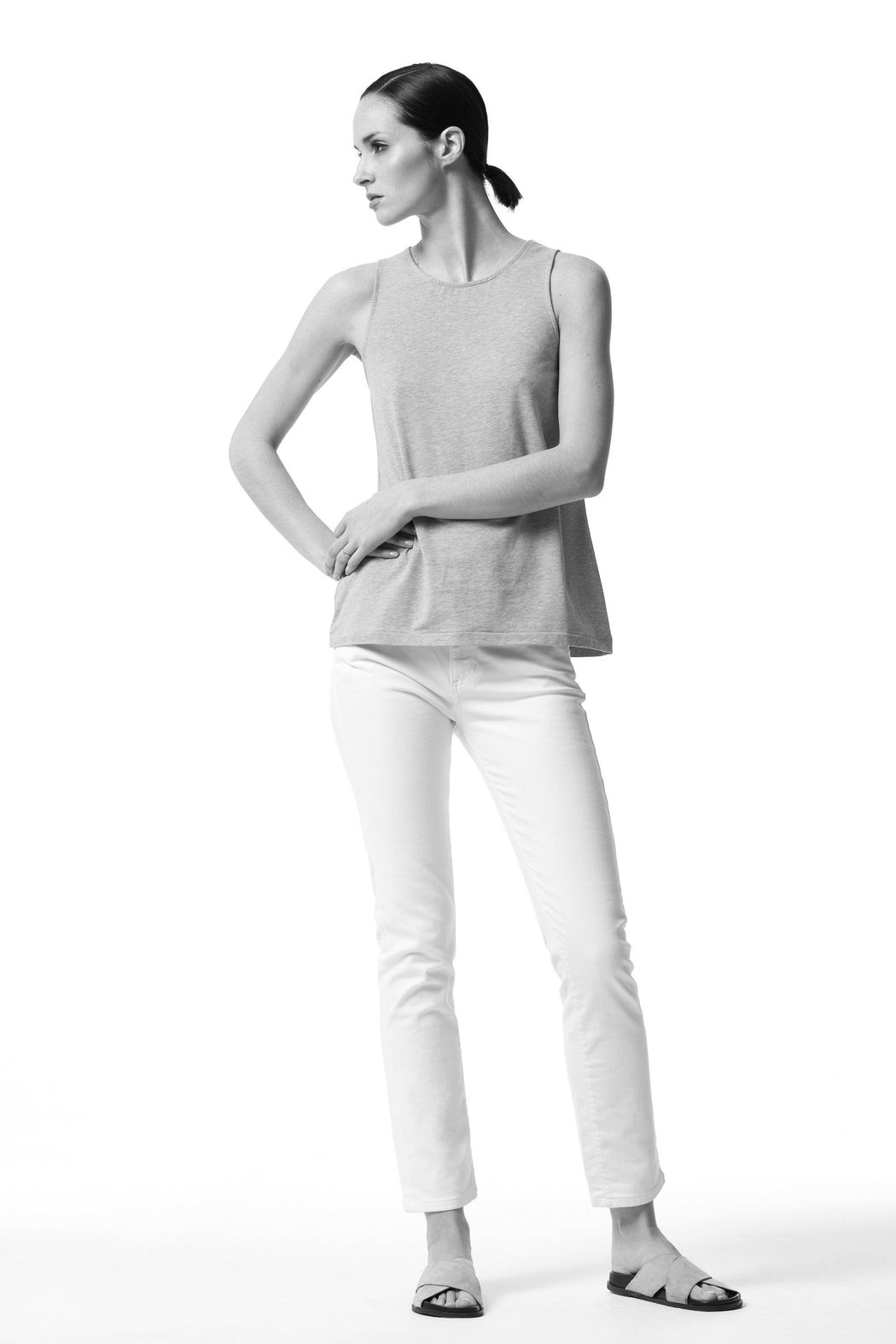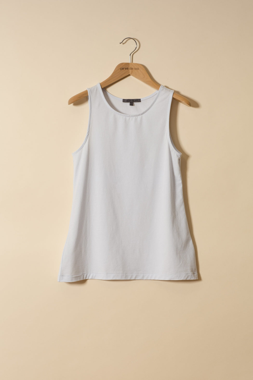 This couture tank-top is made of Egyptian mako cotton COM4-ZÉRO® mixed with 8% Dupont Lycra®. It hugs the body like a second skin, with a hint of stretch that gives the yarn support you’ll adore. To be worn alone or slipped discreetly beneath a cardigan or other tops.