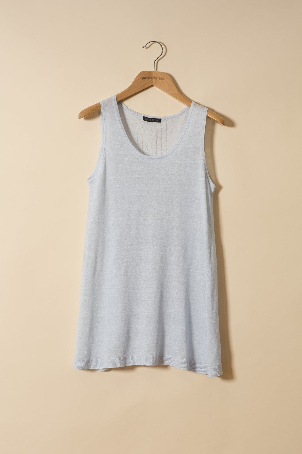 This long sleeveless knitted tank top is made of an Egyptian cotton and linen blend. The pointelle detail in the back adds breathability to the piece for hot summer days. This fibre that we call ‘the summer duo’ exudes comfort and elegance in the warmest, most humid of temperatures. The combination of fibres naturally exhibits a vintage look and is the basis of unique pieces ideal for warmer weather. The linen has an unmatched ability to absorb moisture.