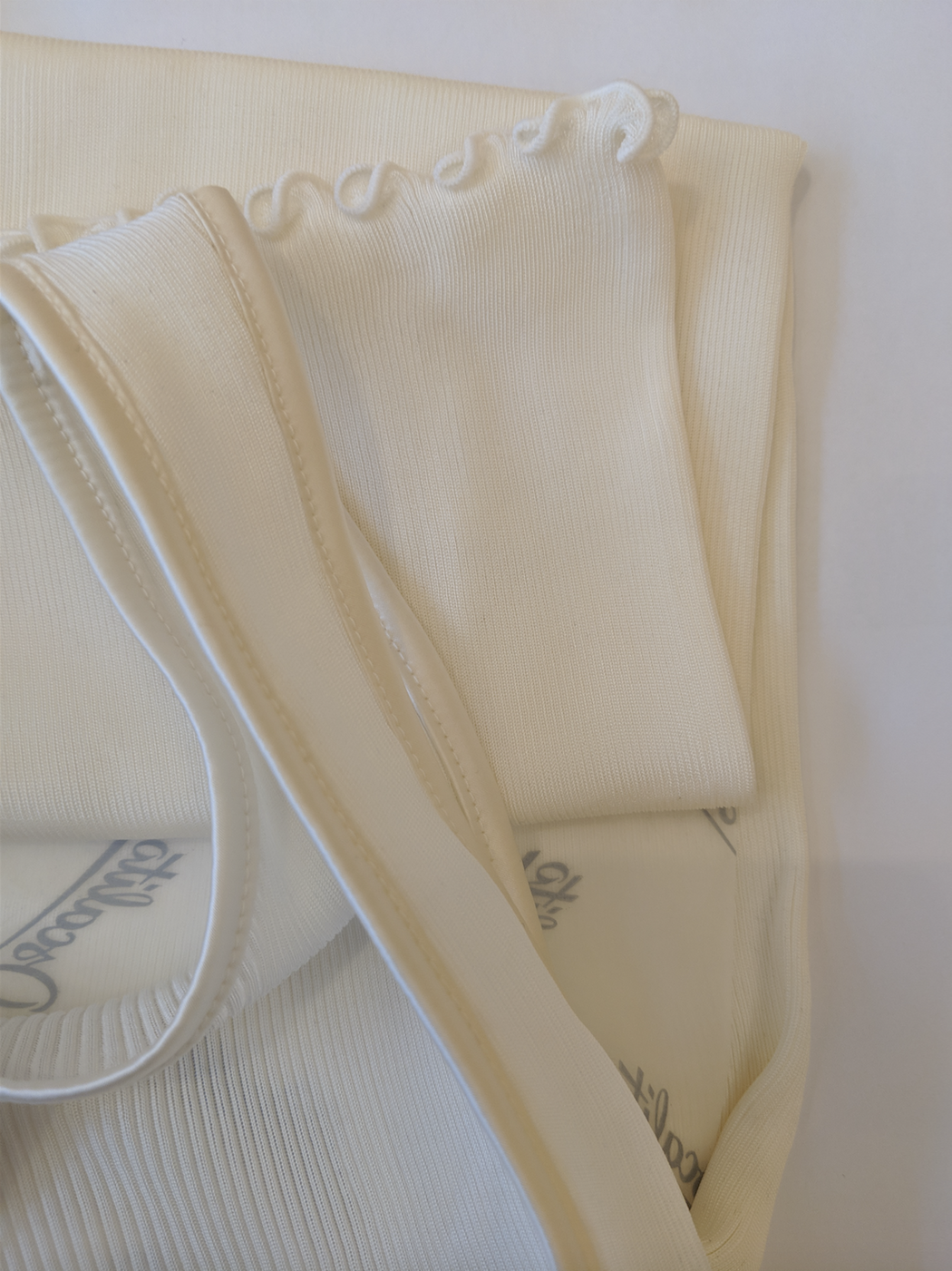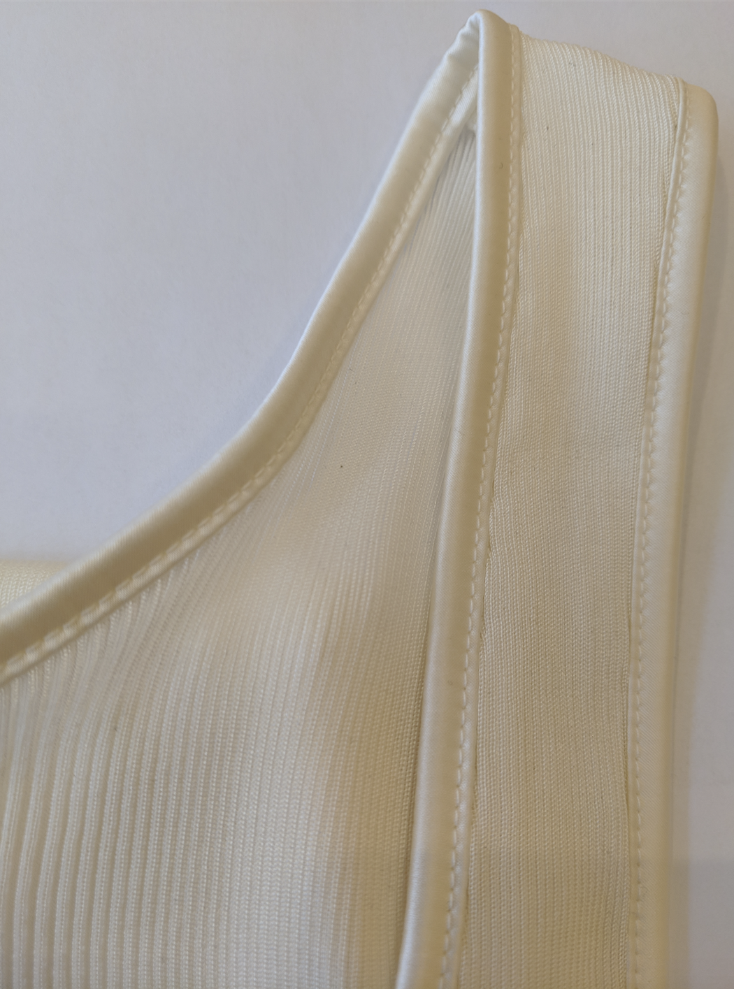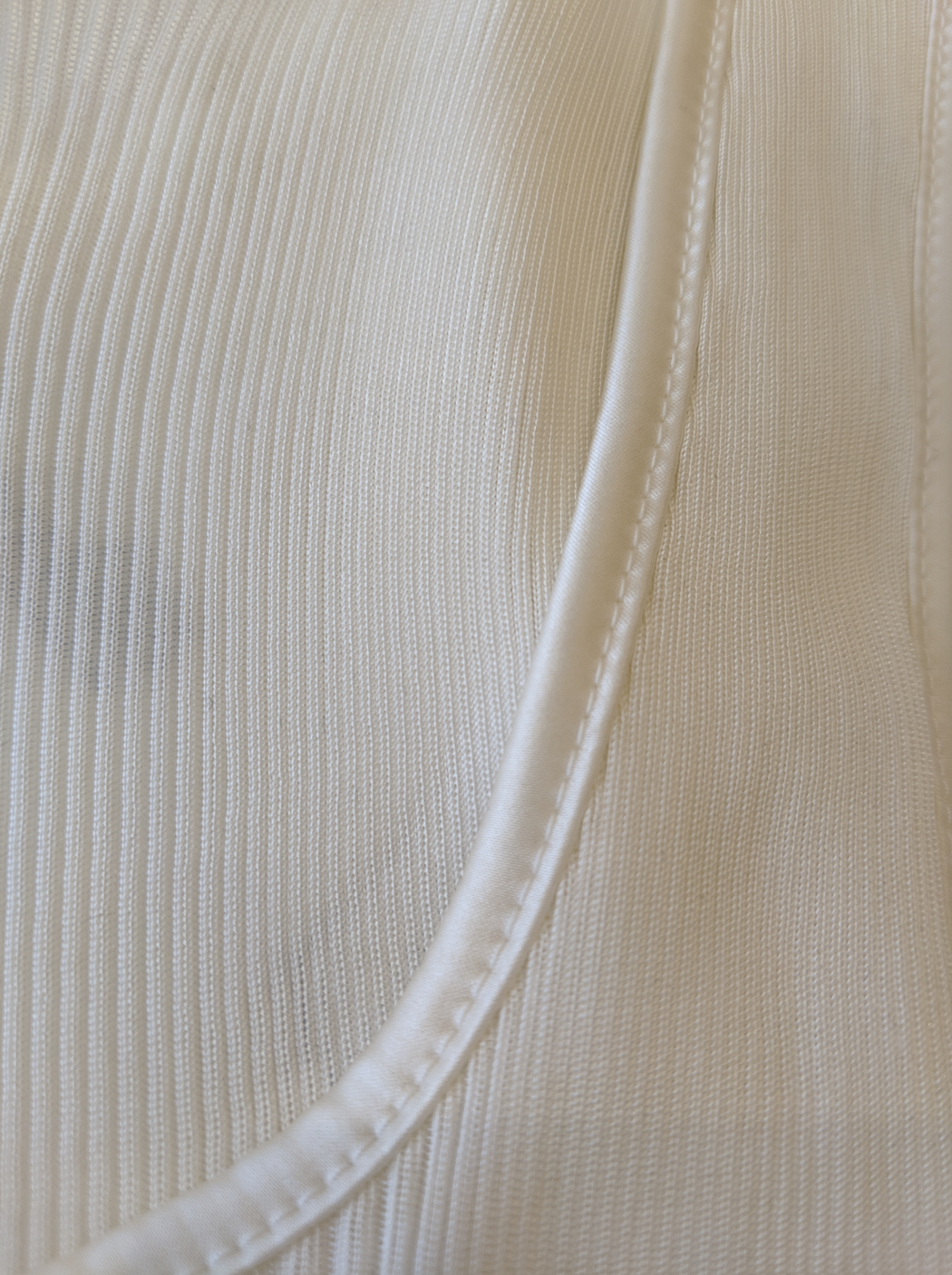 This sleeveless ribbed top is made using Oscalito’s flagship technique: the plissé. Historical circular knitting machines are used to knit this product, operating at lower speeds, which results in a unique fabric that offers long-lasting memory. The Seamless technique offers an incomparable comfort due to the fact that it has no sideseams. The silk used to make this garment, also known as Organzine is spun, dyed and treated in Como, Italy. Organzine calls for fresh, wrapping warmth. This underpiece will deliver when you need it most. ça va de soi chose this second-skin essential for its purity, its resistance and refined make. Available in black, champagne, and smoke.