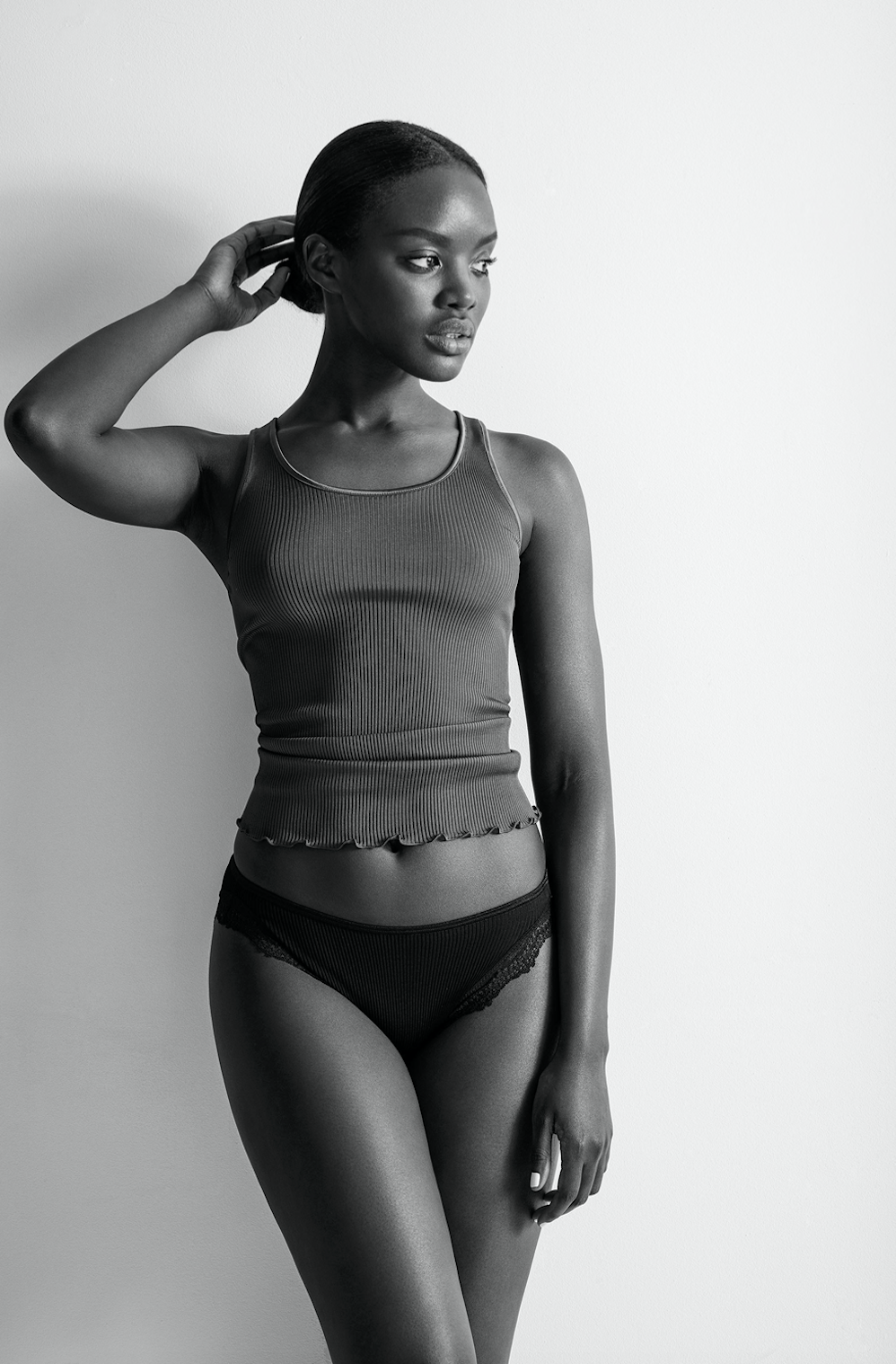 This sleeveless ribbed top is made using Oscalito’s flagship technique: the plissé. Historical circular knitting machines are used to knit this product, operating at lower speeds, which results in a unique fabric that offers long-lasting memory. The Seamless technique offers an incomparable comfort due to the fact that it has no sideseams. The silk used to make this garment, also known as Organzine is spun, dyed and treated in Como, Italy. Organzine calls for fresh, wrapping warmth. This underpiece will deliver when you need it most. ça va de soi chose this second-skin essential for its purity, its resistance and refined make. Available in black, champagne, and smoke.