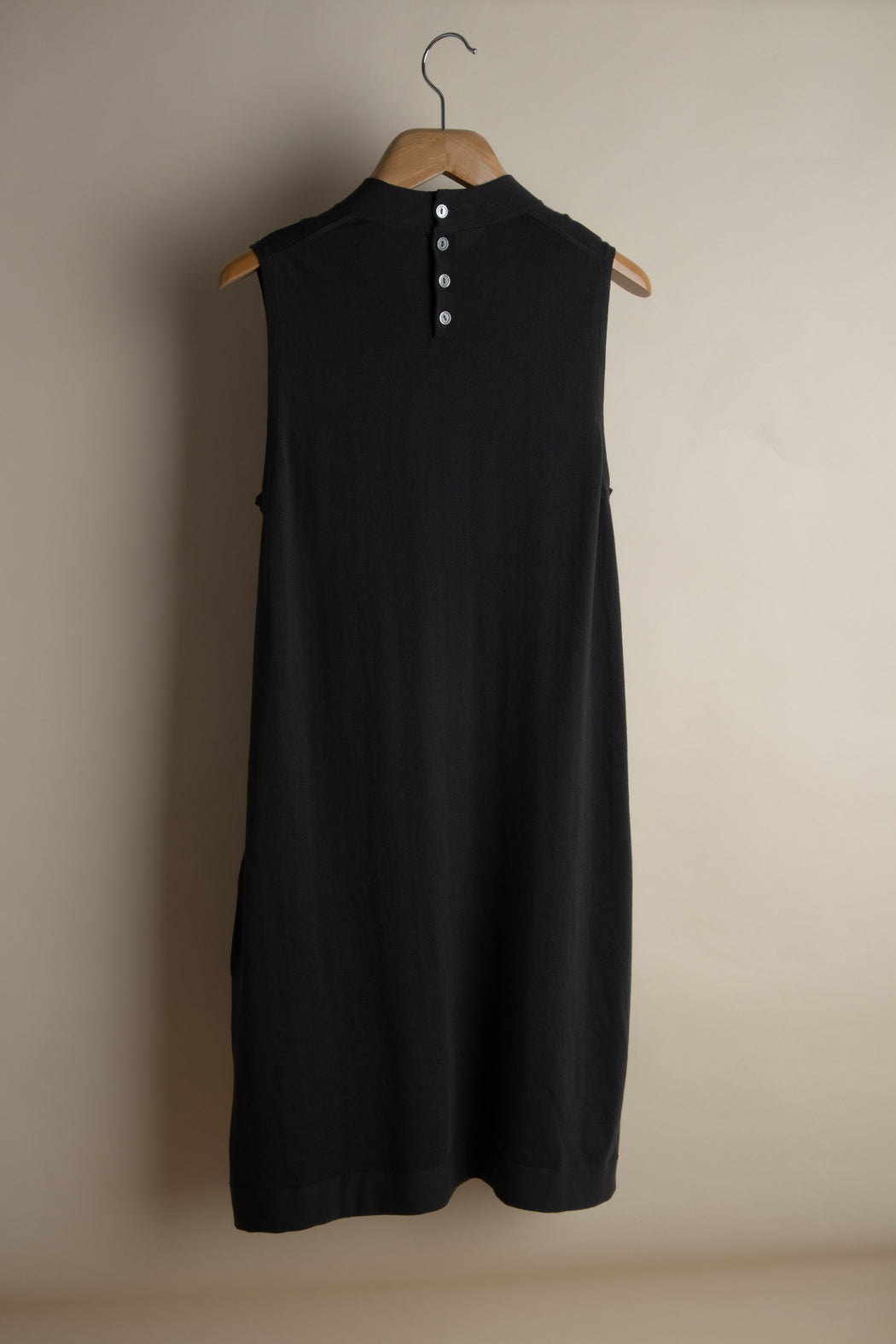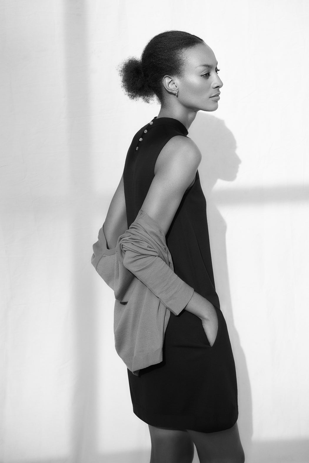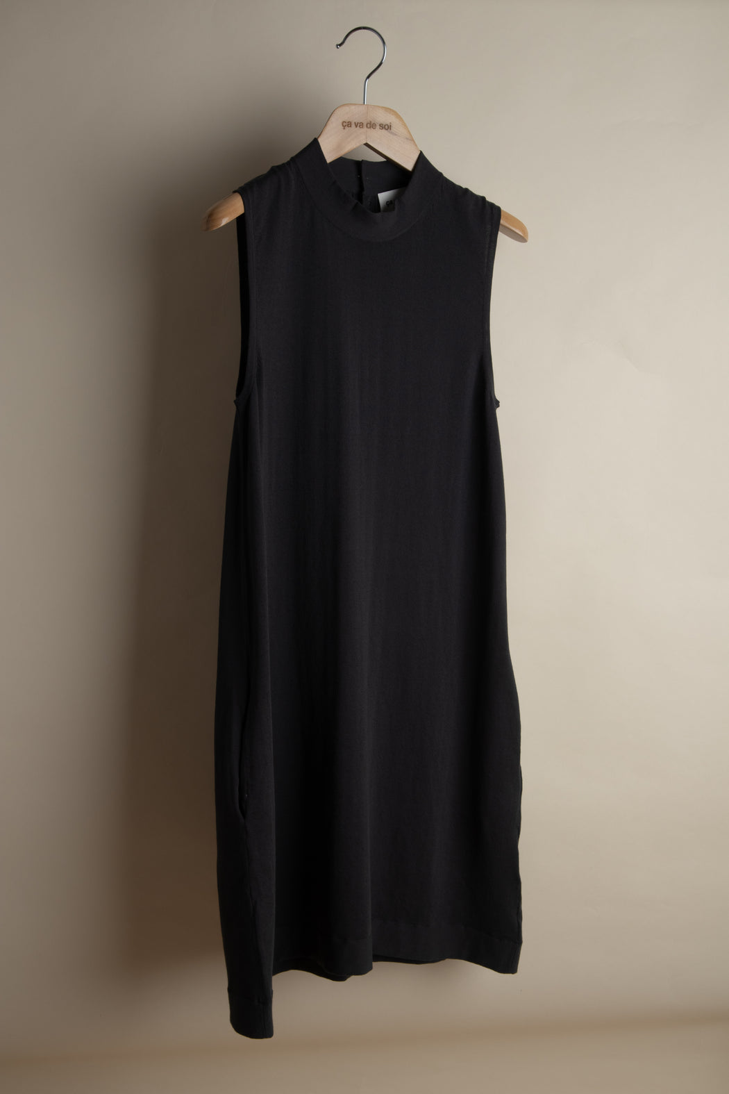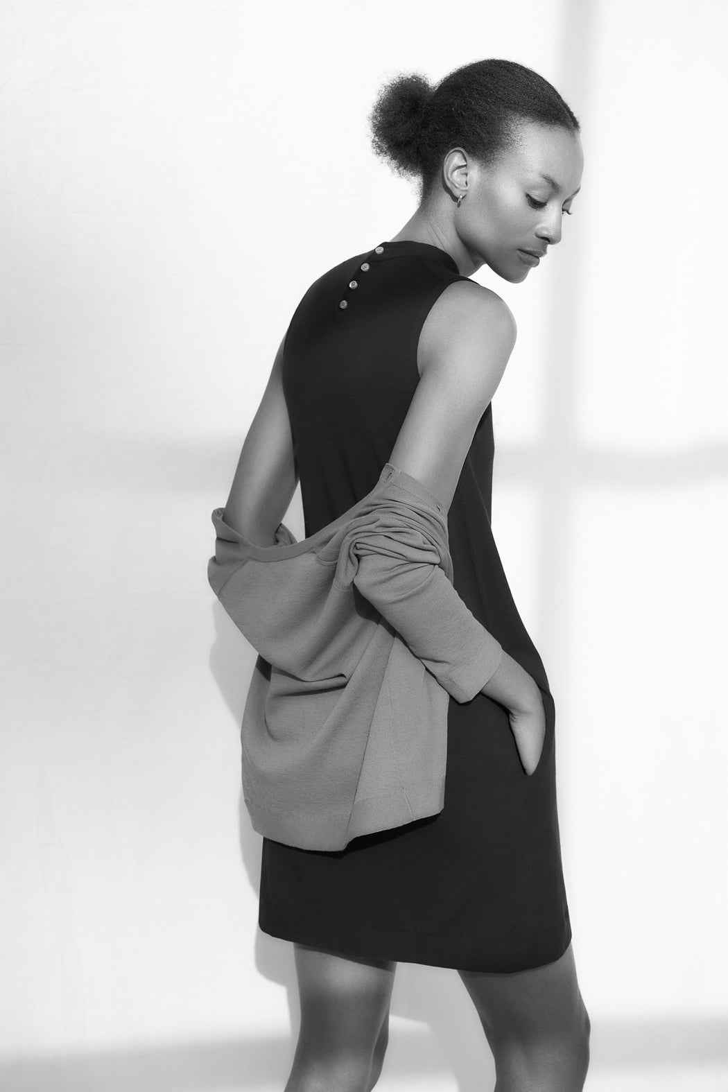 This sleeveless dress with a slightly raised collar and an A-line silhouette takes us back to the heart of the 60s. Charming and wonderfully feminine, its buttons at the back and inserted pockets combine utility with pleasure...