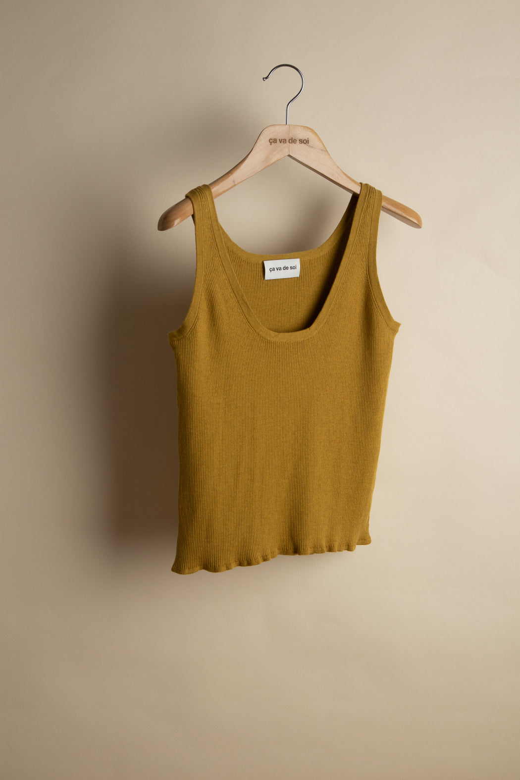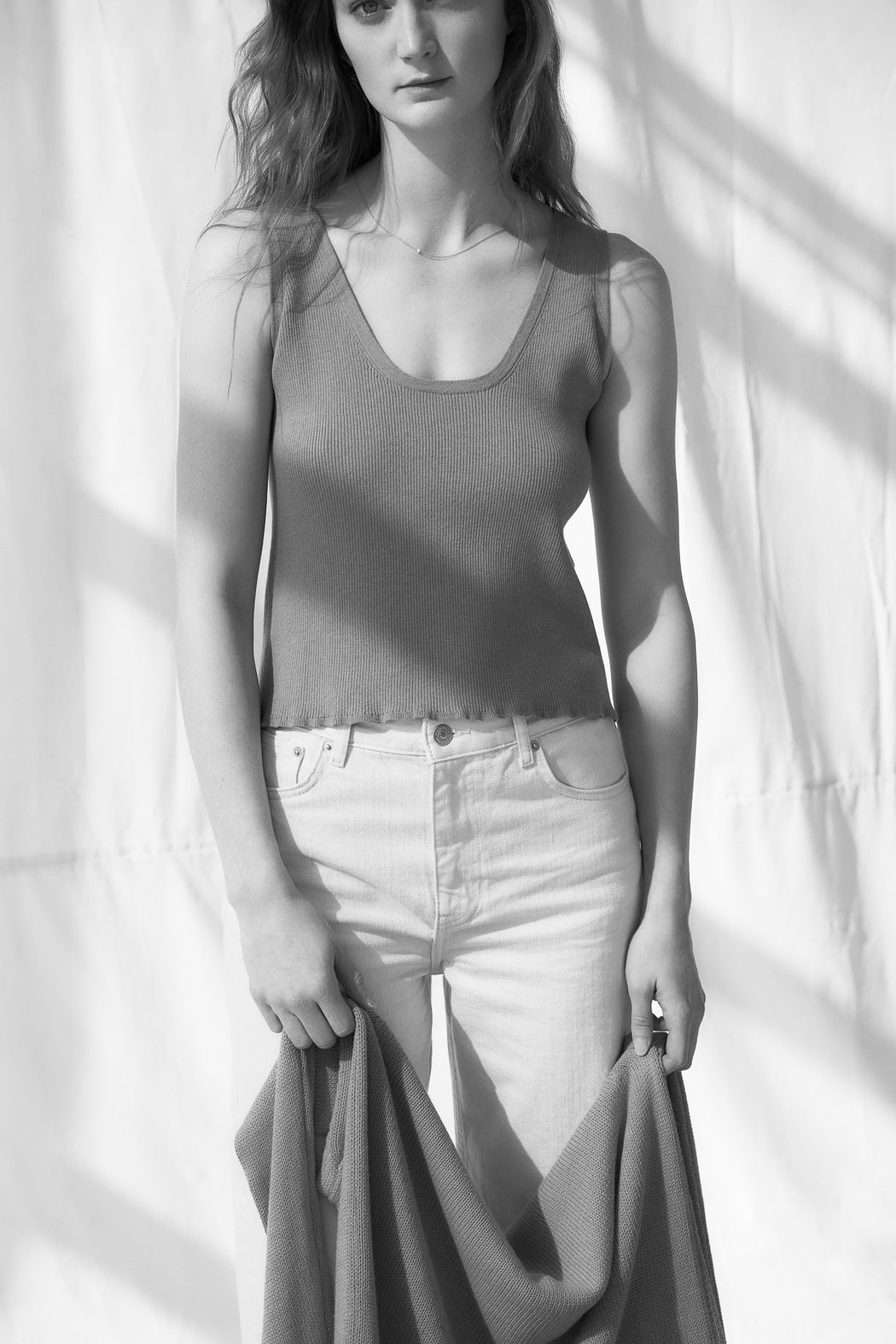Key piece of the season, the essential ribbed 2x2 camisole is revisited with details borrowed from the world of lingerie. It is worn for hot summer days. With wide straps and a plunging neckline, it accommodates all styles and can be worn alone as well as under your favorite cardigan.