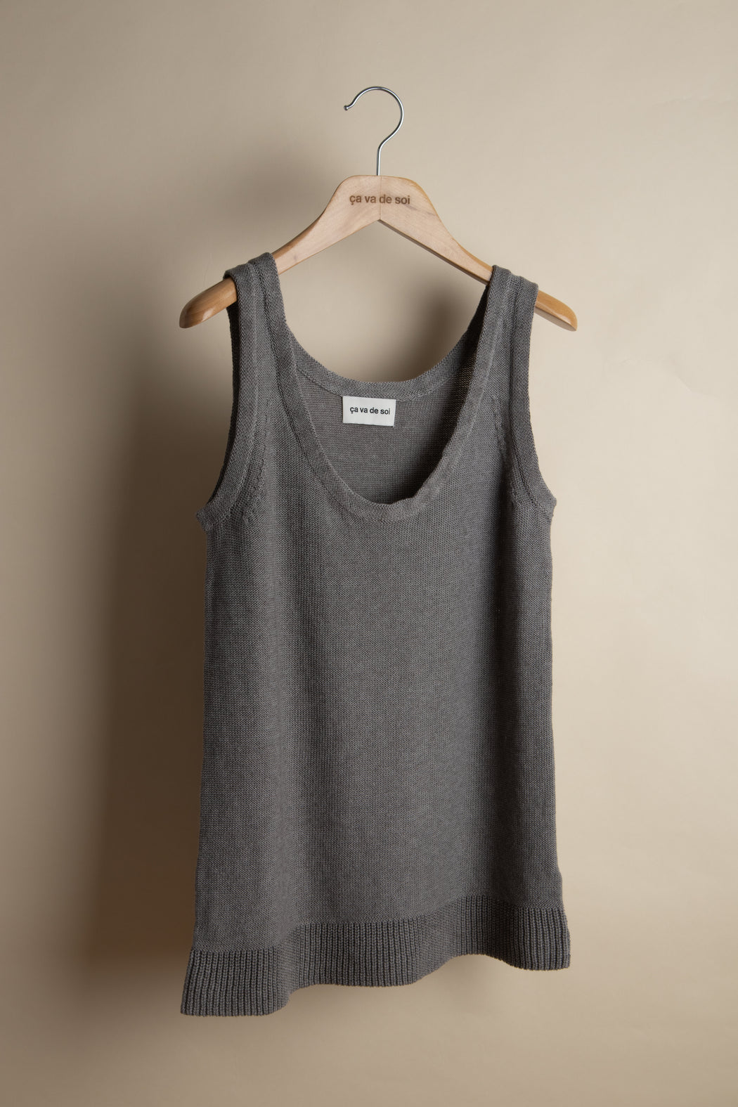 The Douala tank top is reimagined here with an artisanal effect in its reverse jersey texture. Its versatility lies in its very simple shape and generous length. Its clean lines will go well with both a loose or elongated bottom as well as a cropped one: the influence of Jane Birkin follows us, and to our great pleasure, comfort without compromise!