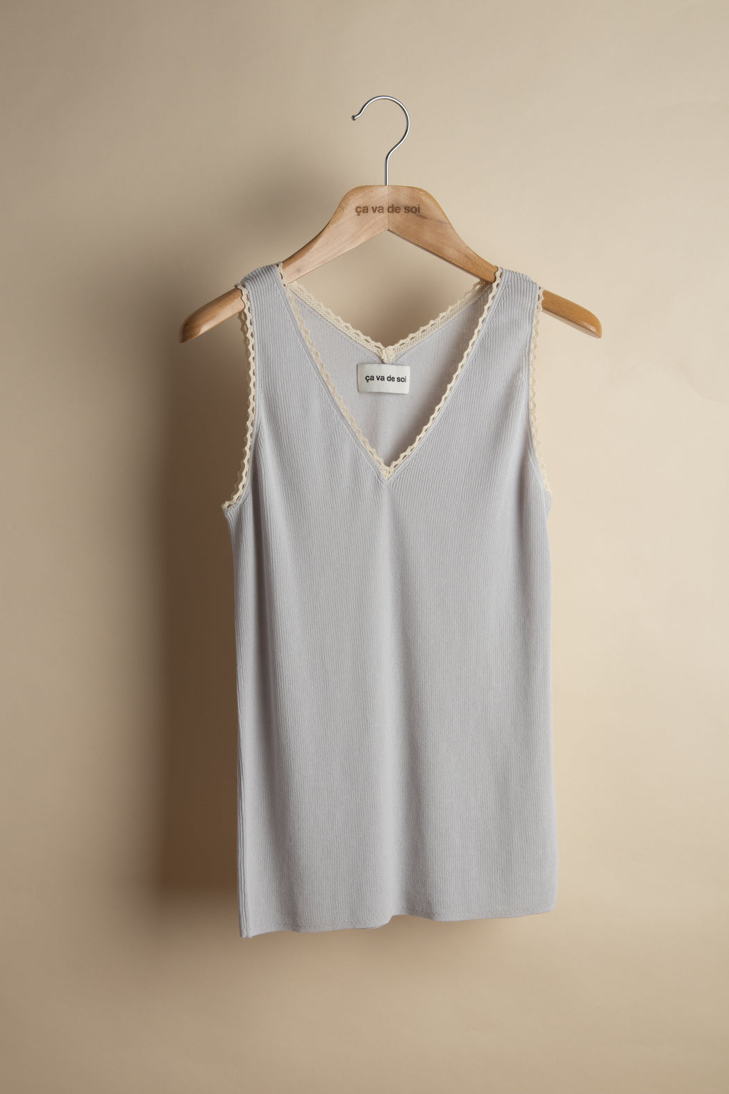 A little charm... This camisole embodies the way to play the 'boho chic' look of the 70s... Its cotton crochet-style lace offers the handmade and nostalgic effect, adding a touch of femininity to your suits and twin-sets.