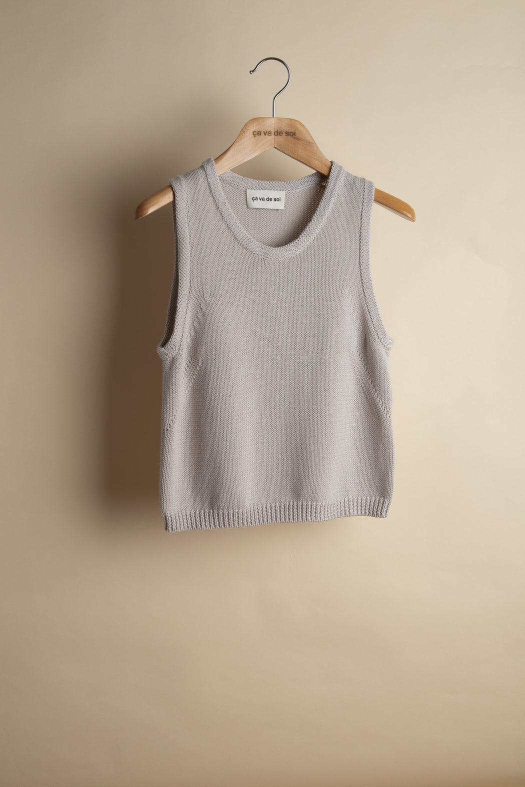 The sleeveless style is making a big comeback, and ça va de soi offer you its soft version with body and hold. Its heavier gauge doesn't take away from its lightness. The play of needle reductions, and shortened silhouette mark the unique charm of this classic piece of the feminine wardrobe, with all modernity. Wear it on its own or as a twin-set with the LEBOU cardigan.