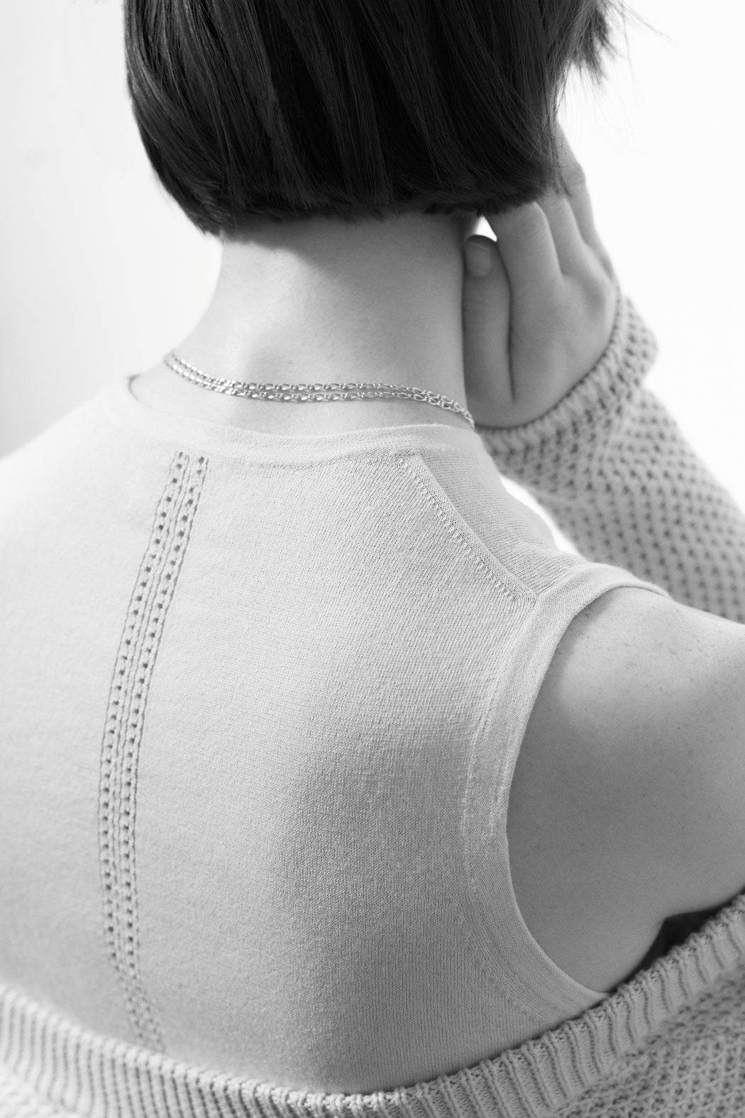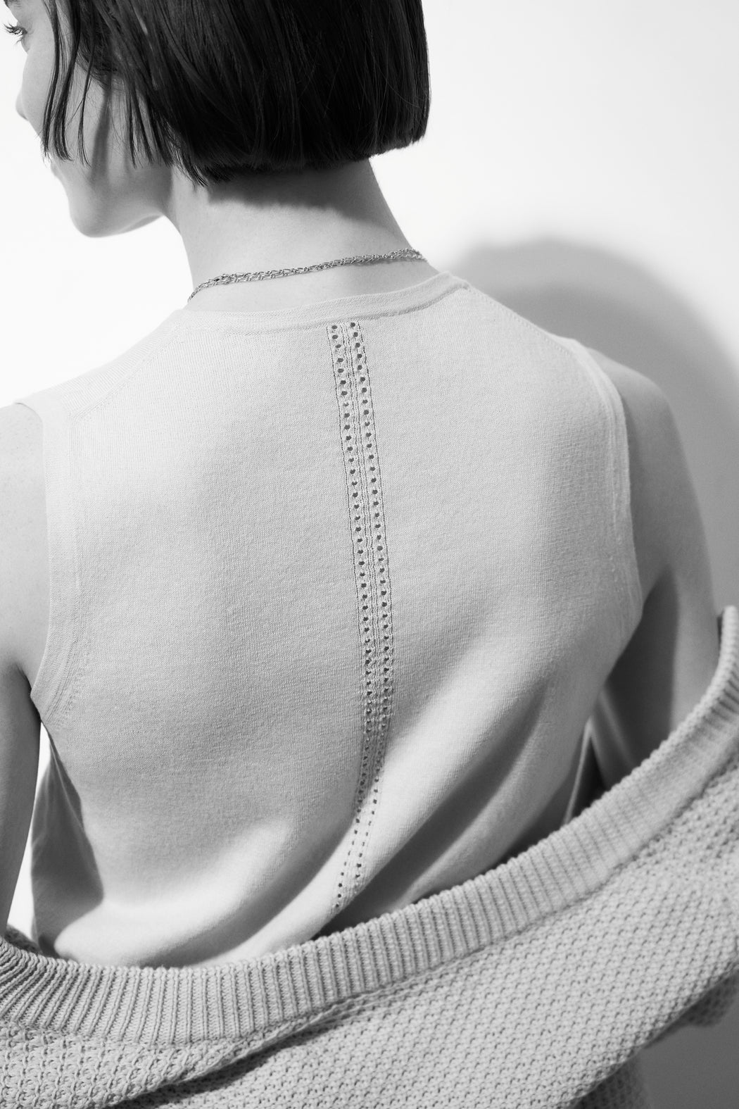 An ultra-chic, feminine take on the sleeveless top, with a delicate openwork line at the back, that is reminiscent of English embroidery. This piece is both timeless and versatile. Refined details like needle reductions darts at the bust and tubular knitted edges, speak to its quiet elegance. It is subtly flared and drapes gracefully.
