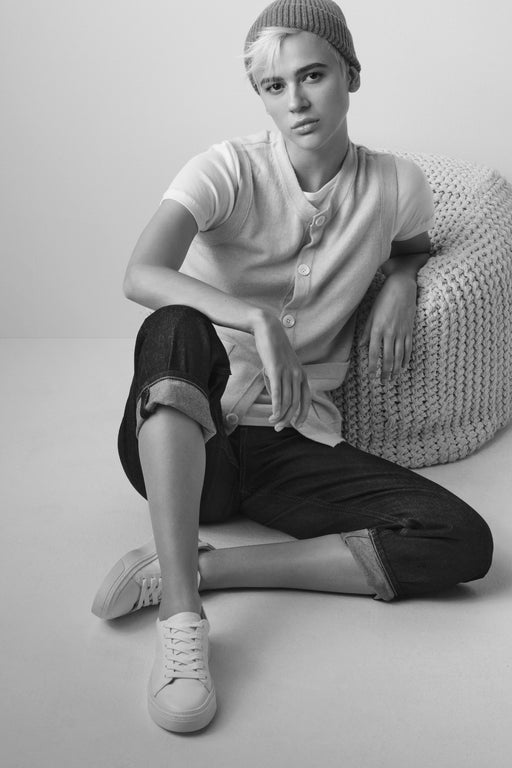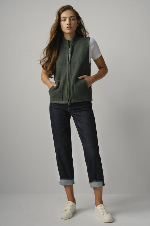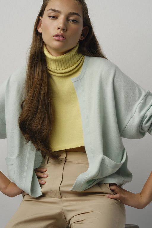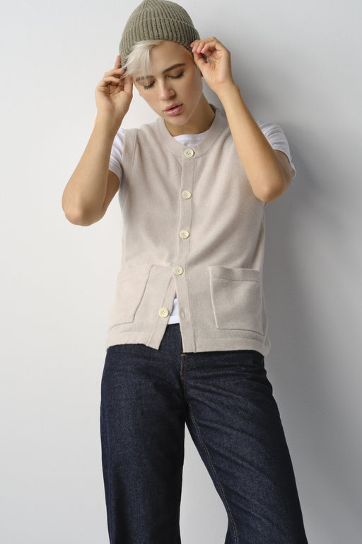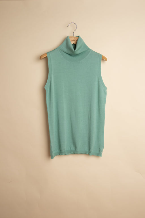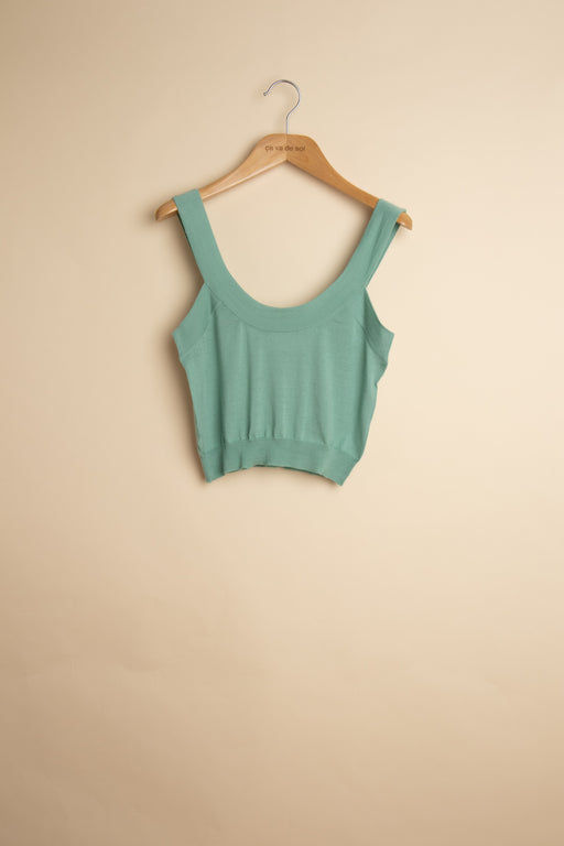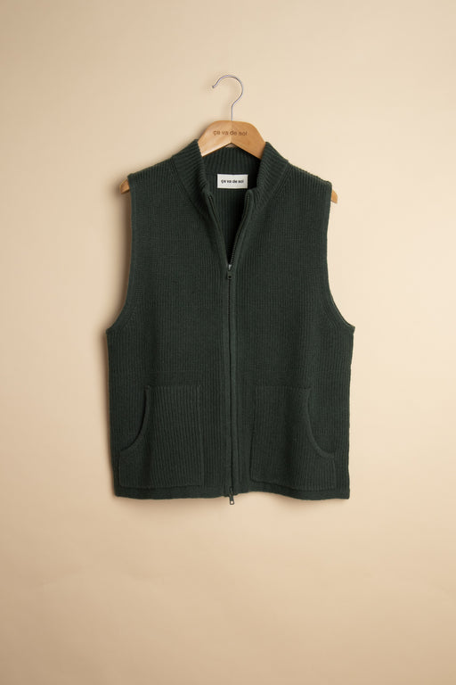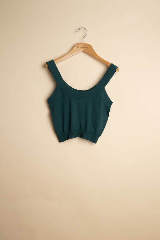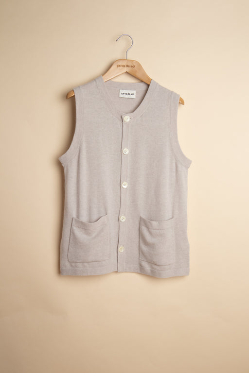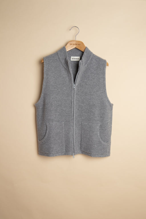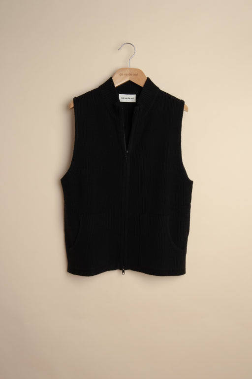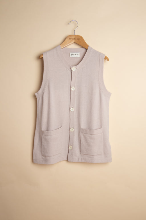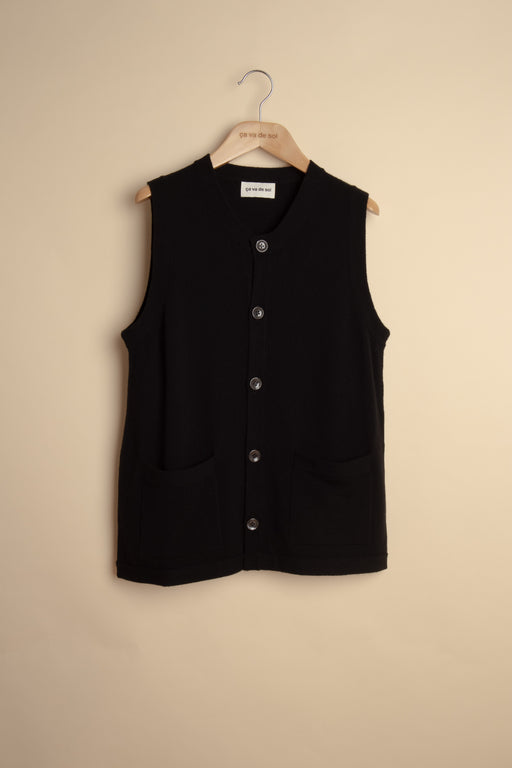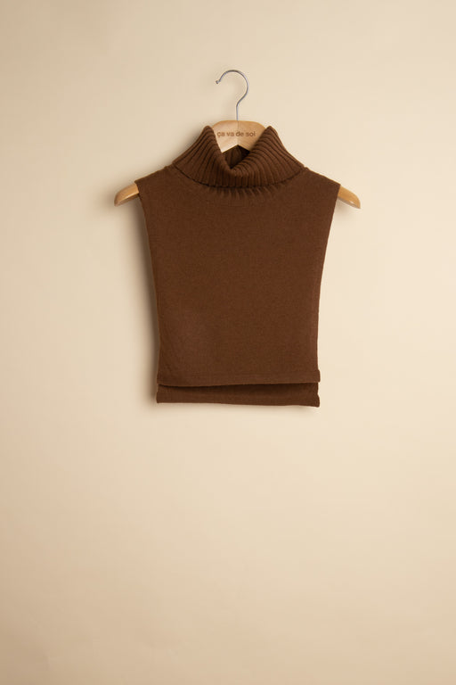 Neither the stitched jersey camisole nor the cami with fine straps, the sleeveless top was initially designed to to work with a cardigan, but wearing alone gave it a lingerie feel. ça va de soi takes the garment to new heights, new possibilities, crafting it with a rounded neckline, a V-neck, a high collar, even turtle-neck, in an ultra-short or classic version. In its cold weather version, it takes the form of a smart vest or perfect tank top.
