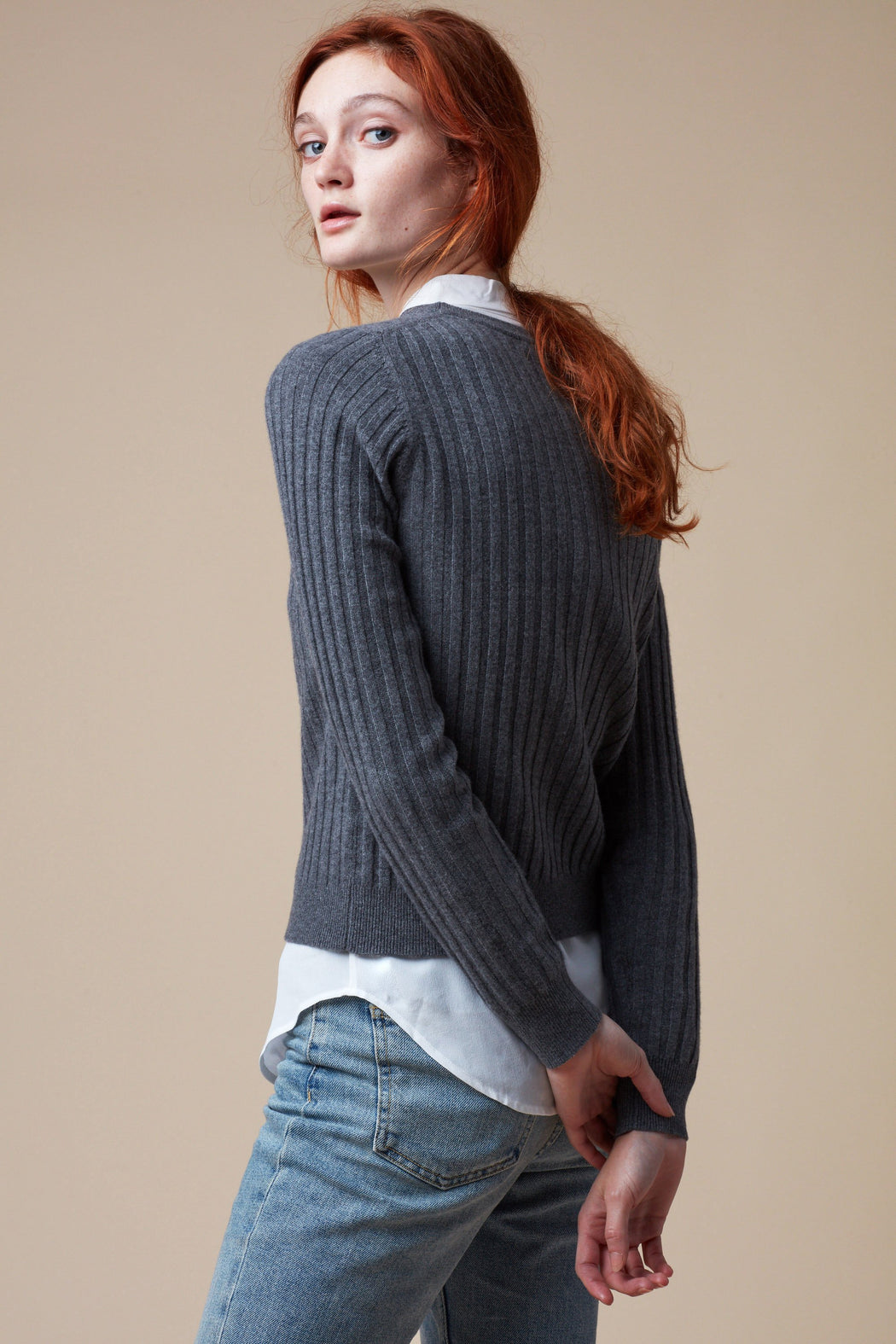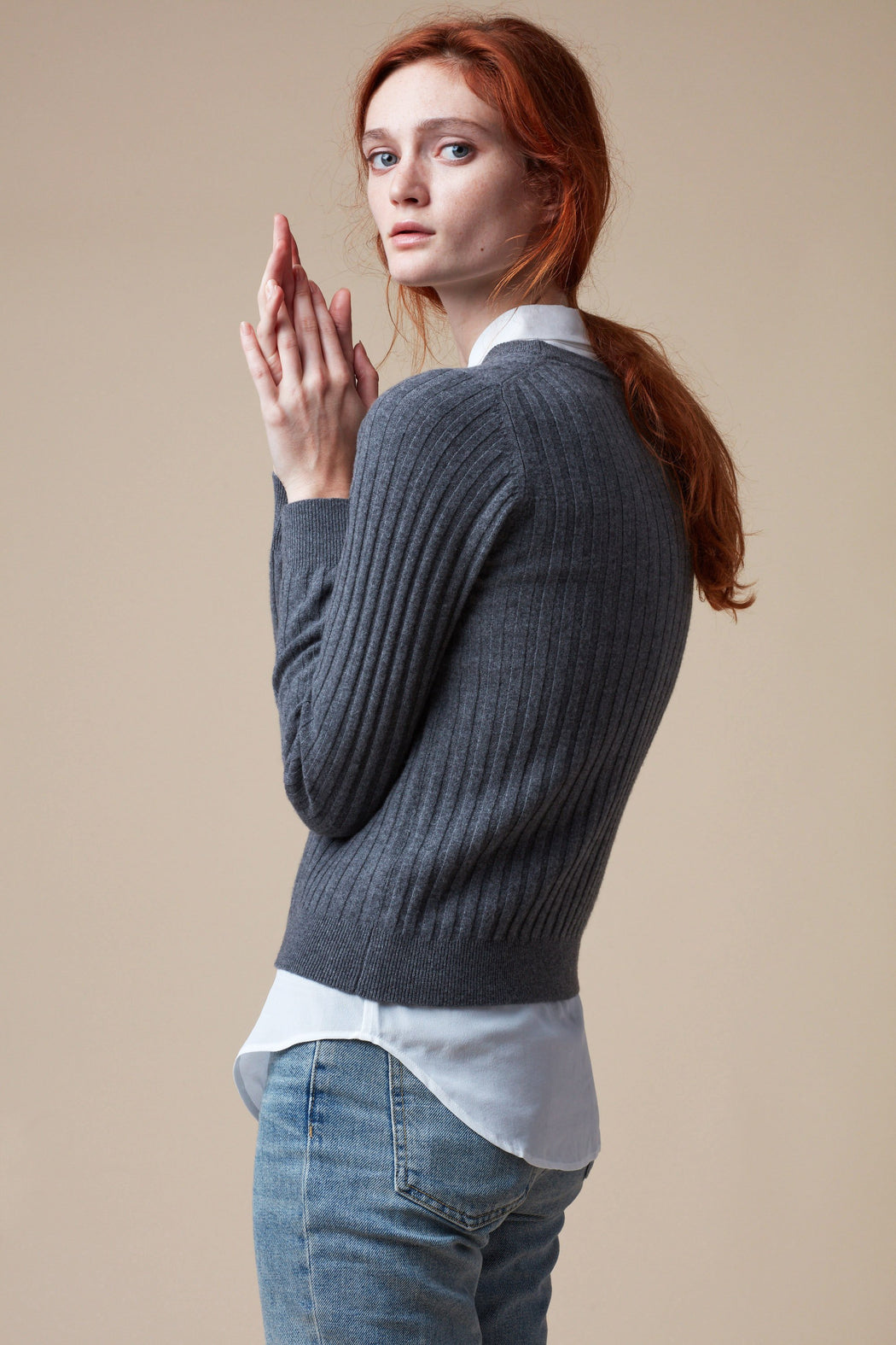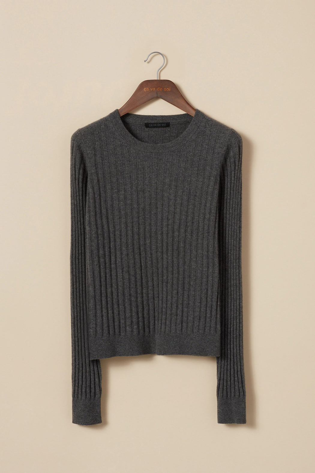 "Nothing is lost, nothing is created, everything is transformed," once said Lavoisier. Indeniably contemporary, this wide-ribbed little sweater, which takes its own spin on the vertical stripe, echoes the style of actresses of the 1960s. To be worn everywhere and with everything, this essential sweater little sweater swiftly makes the perfect sweater list. An interesting mixture of European chic and that famous American casual, its charm comes from its shape, colour and material. A rare and desirable Super 160 merino carded knit. Black, Sapphire, Caviar or Pearl… all these colours win the gold.