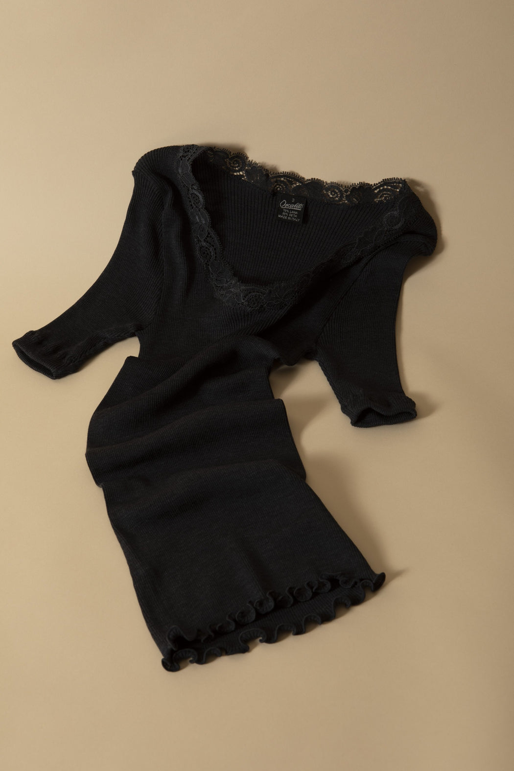 This short sleeve crew neck with a lace neckline will serve you as a winter t-shirt, worn casually with a jeans or on a dressier skirt, Lovely will add a feminine touch to your outfits. Made with an intimate blend of extra-fine merinos and silk for warmth and coziness, its seamless ribbed tubular knitting serves as natural elasticity, adapting to the movements of your body, becoming a second skin. The Calais lace finish of the neckmine contributes to its fantasy and feminity. Discover this knit to enjoy a warm, comfortable winter in elegance and refinement. Entirely made in Italy in the pure European tradition of the art of wearing woolen lingerie. Colors available are champagne, ghisa and black