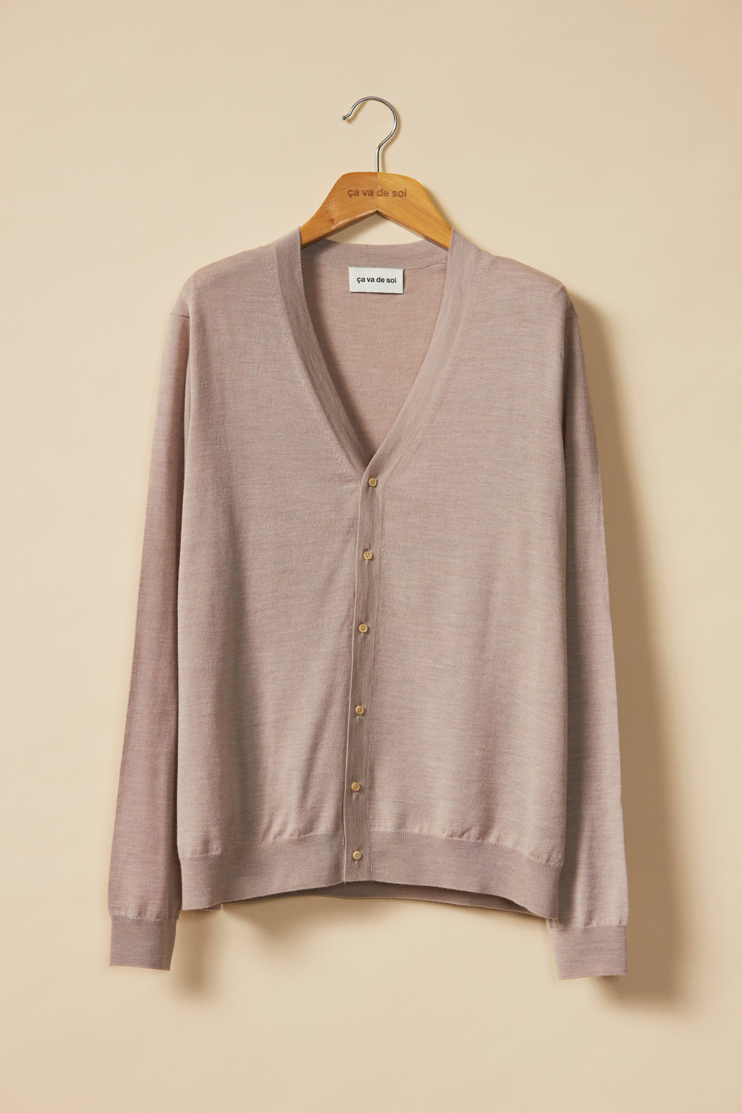This iconic V-neck cardigan is made of fine Super 120 extra-long staples merino wool. Transitional and thermal, ça va de soi uses it for its softness, lightness and freshness. The pure and modern lines of this V-neck cardigan will make you want to take it with you everywhere at all times. May be worn directly on the skin, over a t-shirt or a shirt.