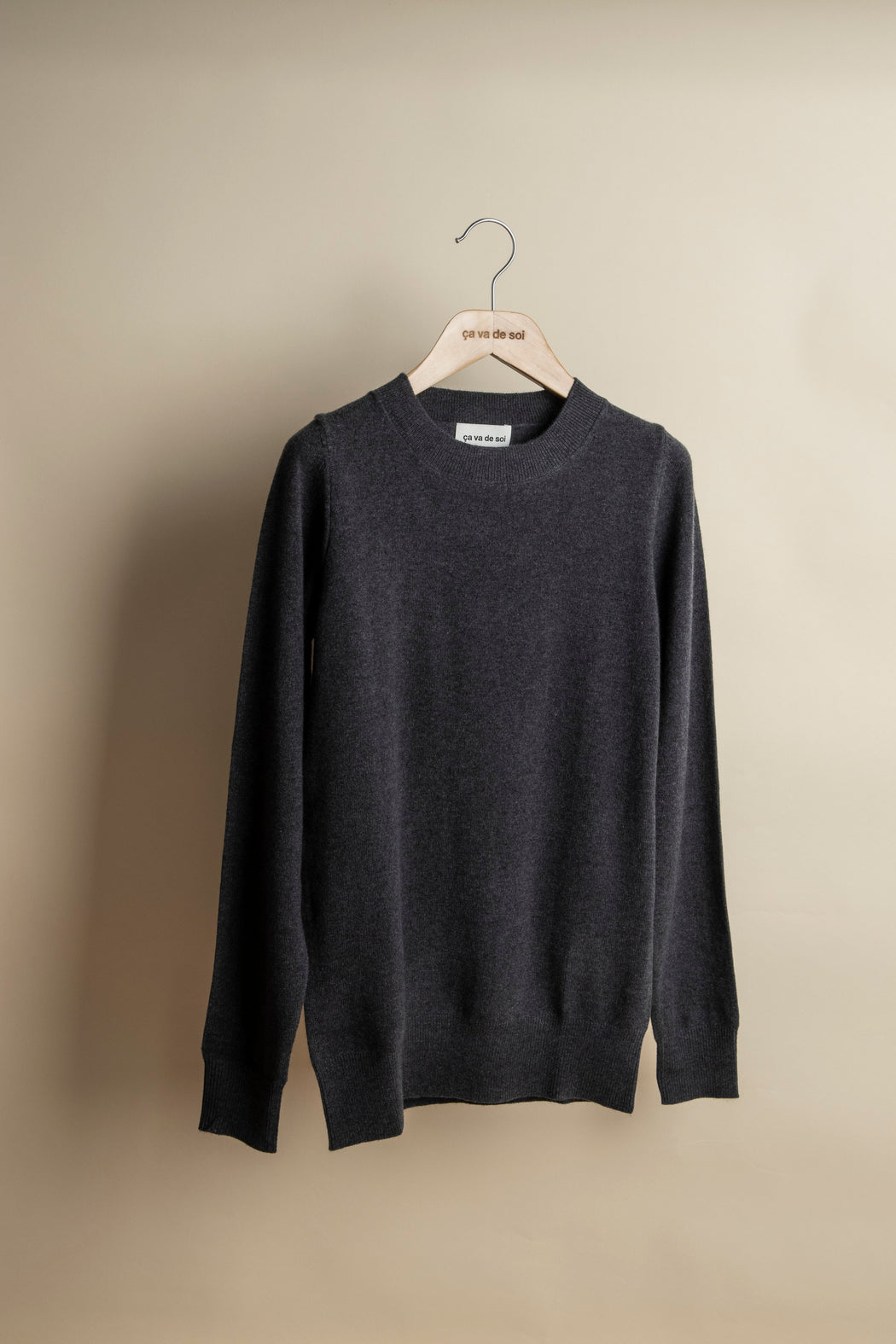 Knitted in carded merino wool, spun expressly in Italy for ça va de soi, whose extrafine (15.5-micron) and ultra-long fibre (a guarantee of longevity and beauty) gives the impression of wearing a cozy cloud — an emotional and intelligent material that understands one’s body language.