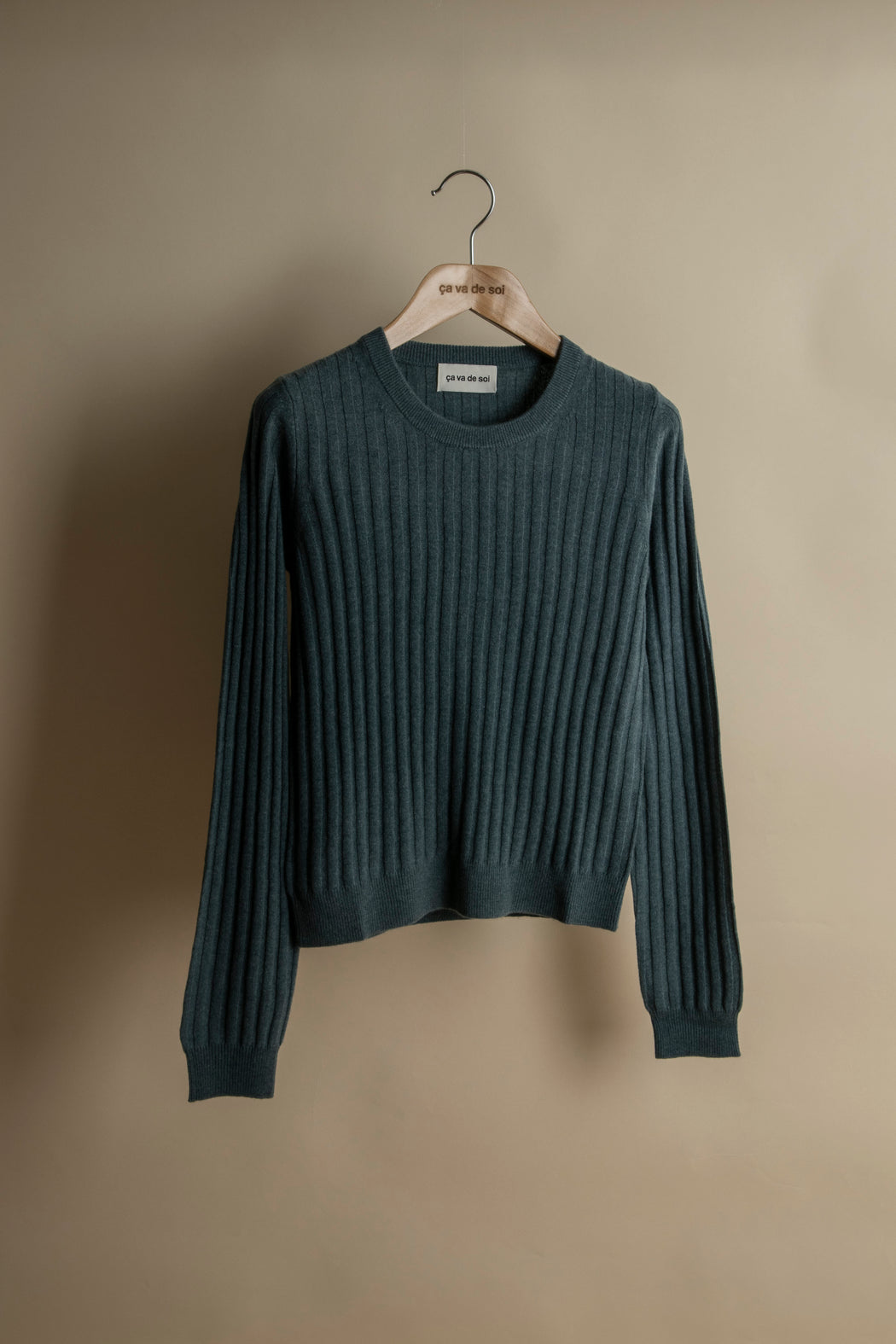 Knitted in carded merino wool, spun expressly in Italy for ça va de soi, whose extrafine (15.5-micron) and ultra-long fibre (a guarantee of longevity and beauty) gives the impression of wearing a cozy cloud — an emotional and intelligent material that understands one’s body language.