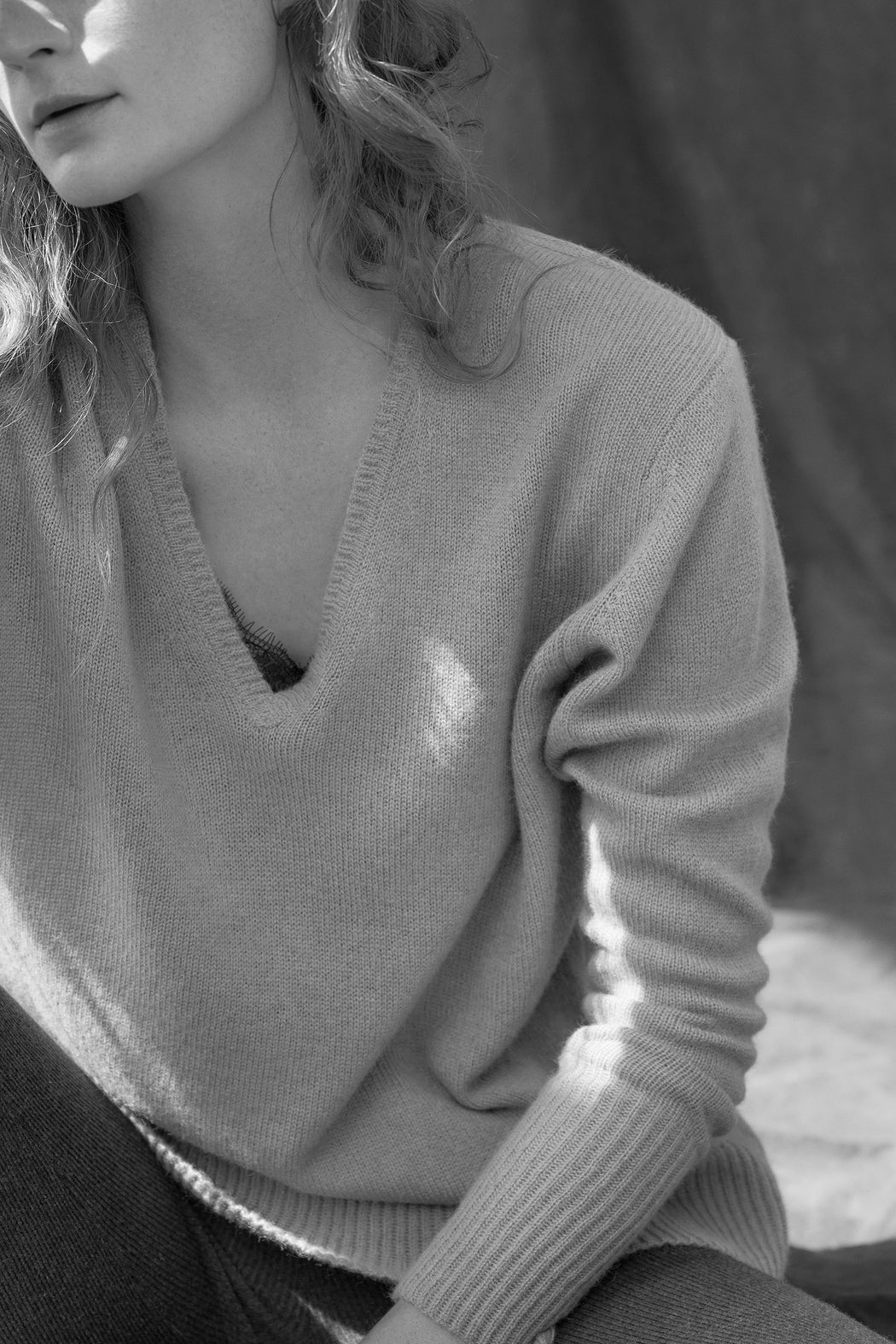 This deep V-neck sweater is designed to highlight the neckline and décolleté offering pure femininity. Long in length, it features wide ribbed bands at the cuffs and hem, ensuring an elegant drape. As always, subtle needle shaping at the shoulders reflects the artisanal craftsmanship behind every knit created by ça va de soi.