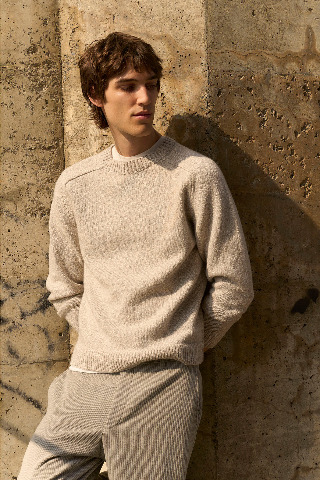 Knitted in lambswool with a blade thread, this pullover is a nod to the iconic wool tweeds of the 1920s. A loose, unisex cut brings effortless sophistication. It’s the kind of sweater you love to borrow from your father’s or partner’s wardrobe—or simply claim as your own. With a crew neckline and raglan sleeves, it combines casual style with extra comfort. A true warm and utilitarian pullover, as at home in the mountains as on the high seas—an enduring piece for life.