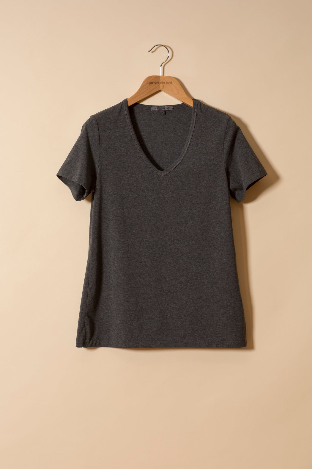 This A-line V-neck t-shirt is made of Egyptian mako cotton COM4-ZÉRO® mixed with 8% Dupont Lycra®. It hugs the body like a second skin, with a hint of stretch that gives the yarn support you’ll adore. To be worn alone or slipped discreetly beneath a cardigan or other tops.