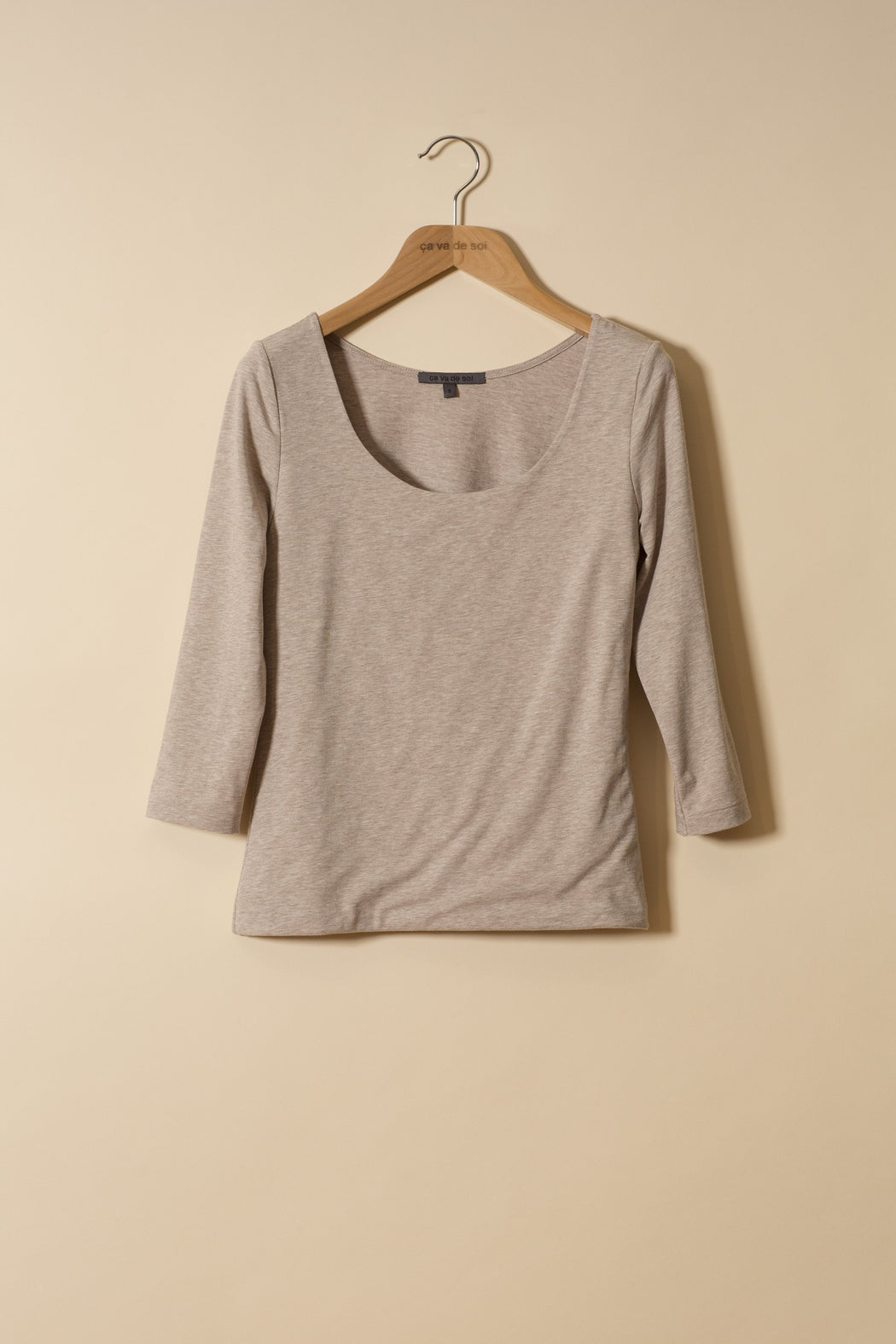 This t-shirt is made of Egyptian mako cotton COM4-ZÉRO® mixed with 8% Dupont Lycra®. It hugs the body like a second skin, with a hint of stretch that gives the yarn support you’ll adore. To be worn alone or slipped discreetly beneath a cardigan or other tops.
