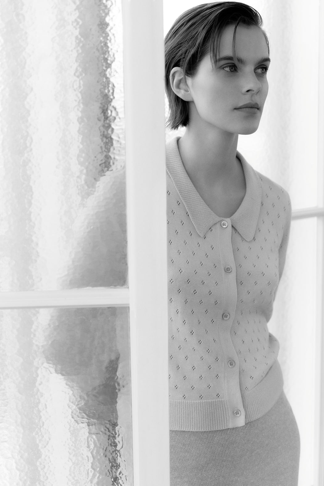 A feminine piece, both in its cut and its decorative detail, the openwork flowers is the ultimate charm… The polo collar and the ribbed finishes give it structure. The tubular buttoning and mother-of-pearl buttons ensure a perfect drape. A piece to be worn on its own, open or closed, with any bottom.. It ensures a singular expression to an outfit.