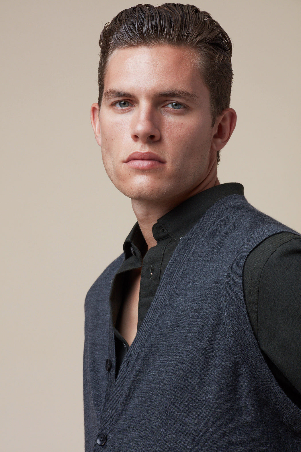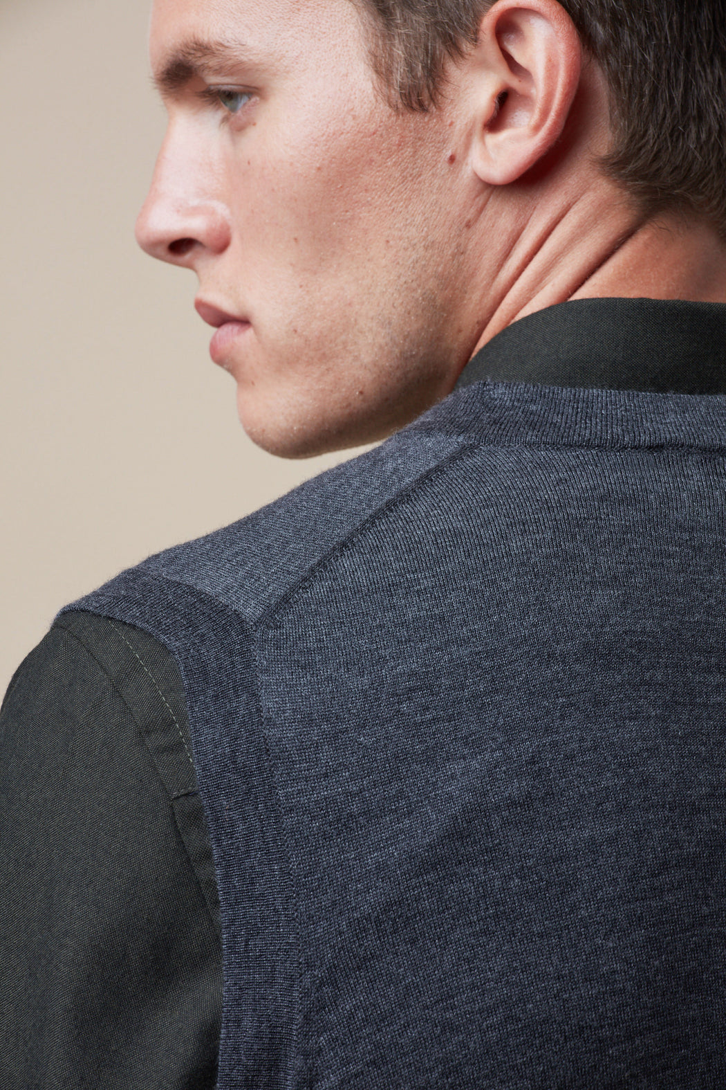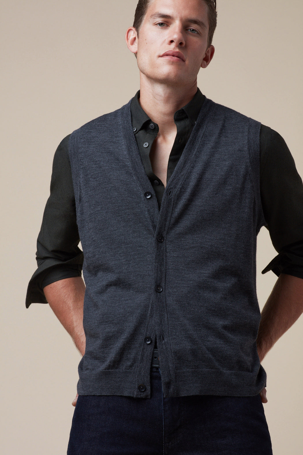 If there’s a masculine classic out there that defies time, it is this sleeveless jacket with smooth tubular knitting, inspired by the 1970s icons. Modernized and embellished with five curved natural horn buttons, this extra-fine merino knit is available in two subtly complex, rich heathered shades - Camel and Anthracite. It also comes in our Absolute black and Sapphire.