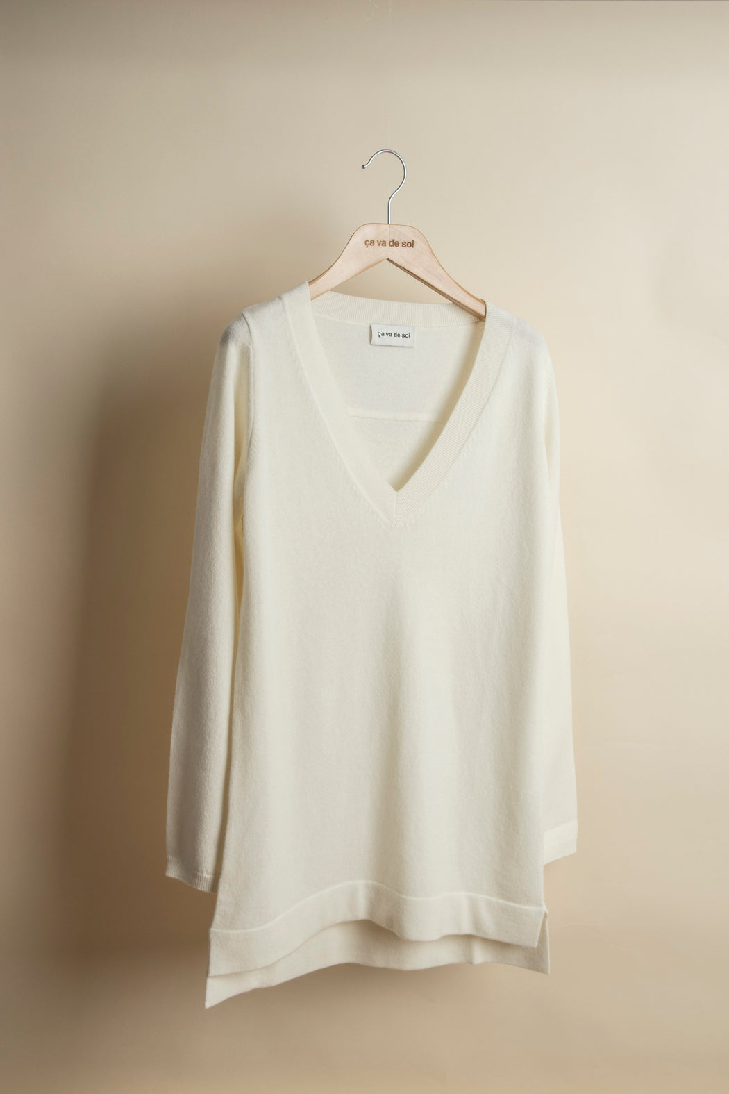 Originally a common garment in ancient Rome, then back in the spotlight in the early 70s, the tunic is revisited here by ça va de soi, in its most beautiful knitted version. Today, it displays a style that is both casual and dressy, depending on whether you wear it with leggings or cigarette or flare pants. Its deep V-neck will be your major asset, and its small slits on the sides are a refined and practical detail. Slightly shorter on the front than on the back, it is a piece full of character, a sweet blend of femininity and nonchalance.