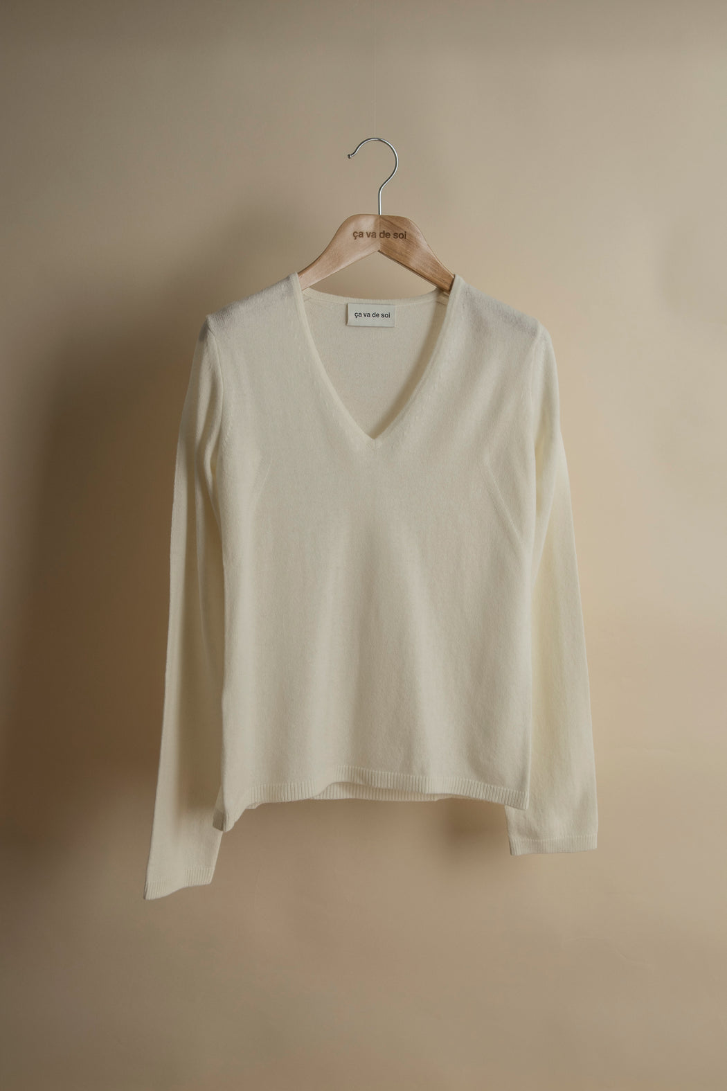 Knitted in carded merino wool, spun expressly in Italy for ça va de soi, whose extrafine (15.5-micron) and ultra-long fibre (a guarantee of longevity and beauty) gives the impression of wearing a cozy cloud — an emotional and intelligent material that understands one’s body language.