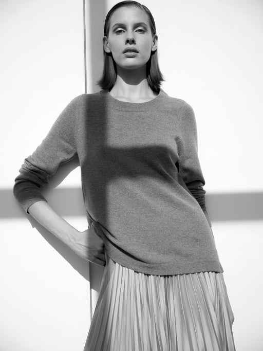 Even our oversize, enveloping sweaters are made off fibres that we double or triple to help you survive the cold in complete comfort. Wools are also distinguished by the technique used to prepare them for spinning, either carding or combing. Our cashmere and virgin wool are carded fibres for more warmth and durability an for a more rustic finish. Our extra-fine merino falls into the category of combed wools which are more refined since they look perfectly even. The style of knit dictates the choice of technique.