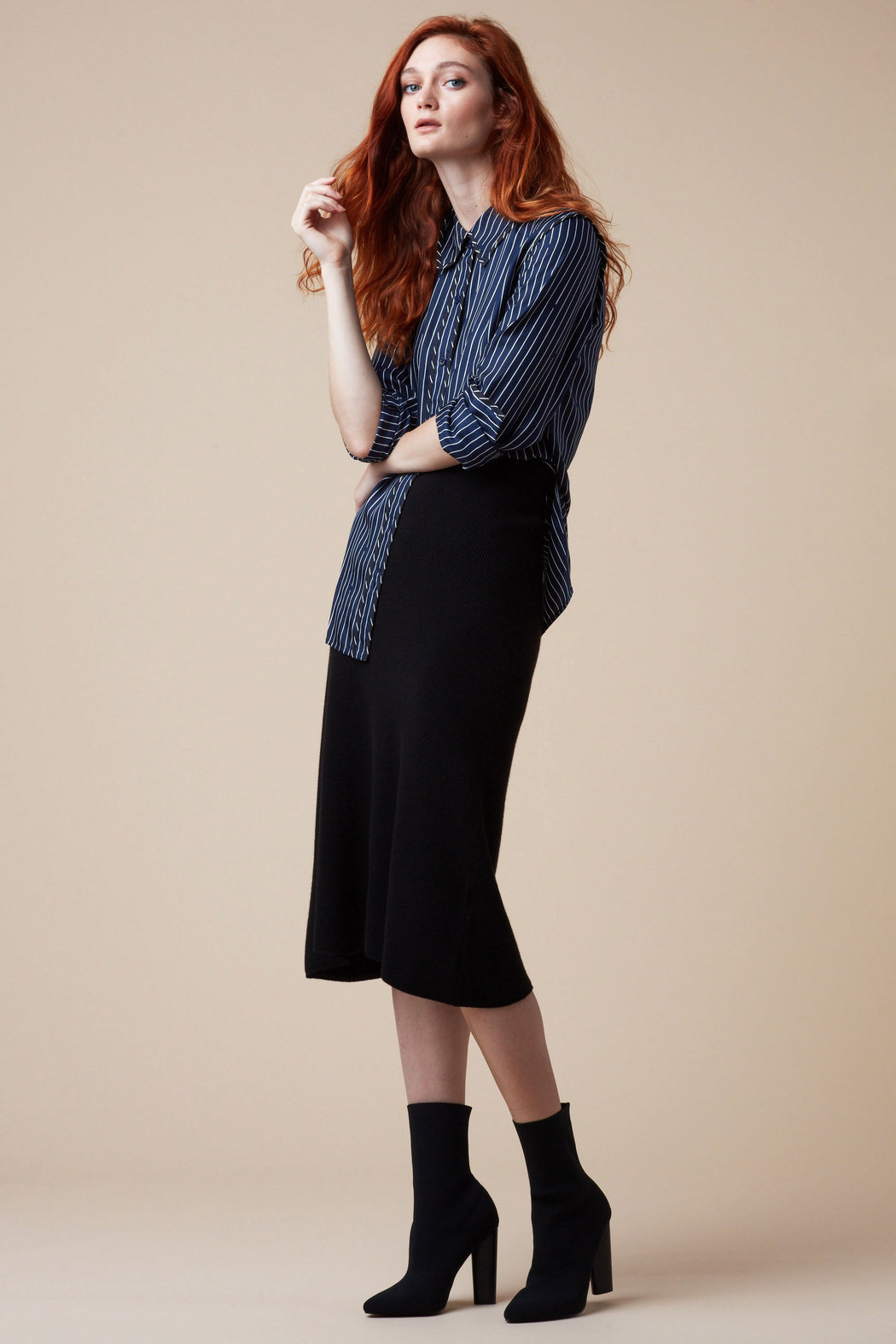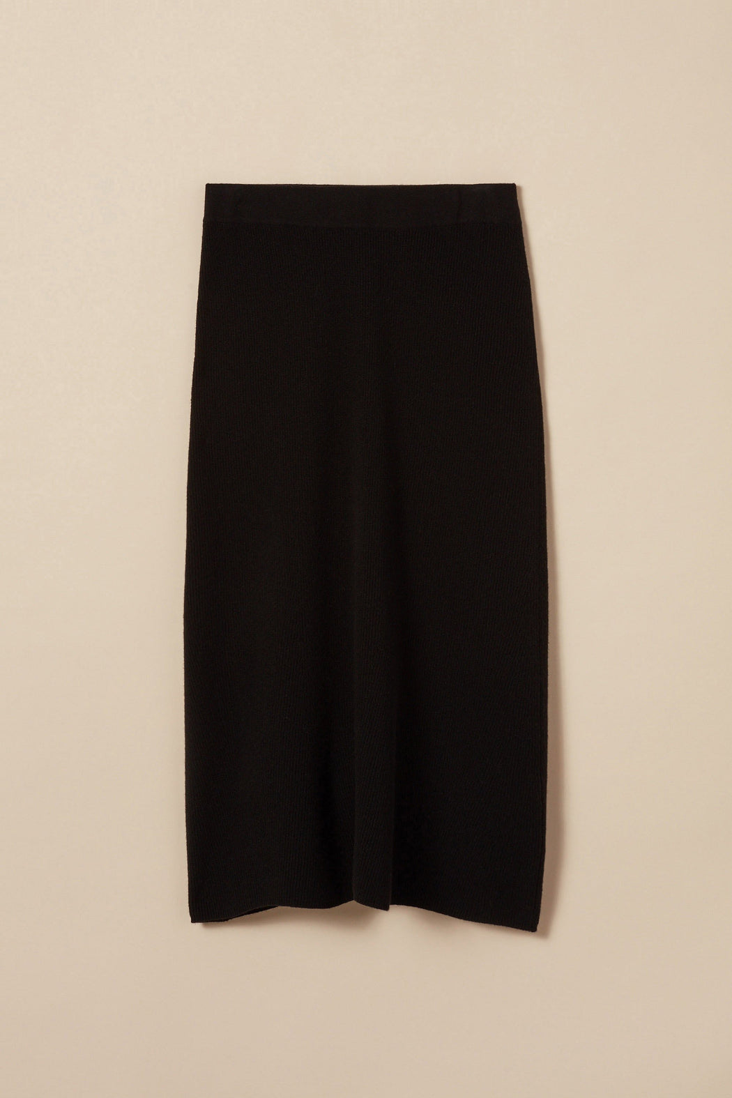 The devil is in the detail when it comes to this skirt and its embodiment of perfect bohemian chic. Every aspect embraces the spirit of this style. The material already. Australian Super 160 merino wool gives the sensation of extreme finesse within the notion of abundance and easy, airy comfort. Its English ribs, giving it a handmade aesthetic, create a certain volume that embrace the shape of the body. A little retro, so practical, it switches up the code with its various combinations. Under a tunic or a cardigan, or with an oversized sweater, it can be worn in so many ways. Its middle name is versatility. Inspired by the late 1960s, highly contemporary in spirit. Black, Sapphire, Caviar or Pearl, each one has its own charm and speaks its own language.
