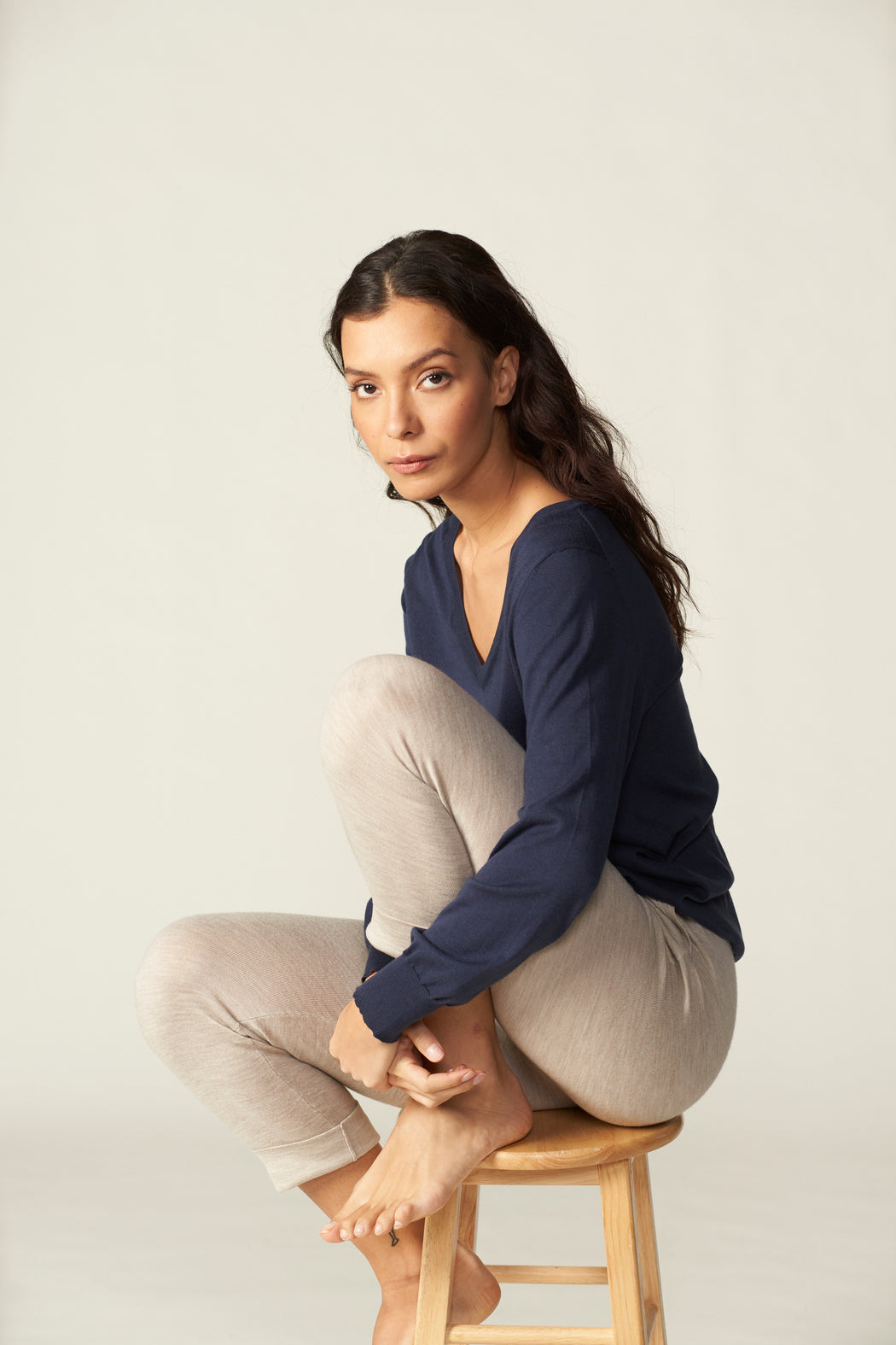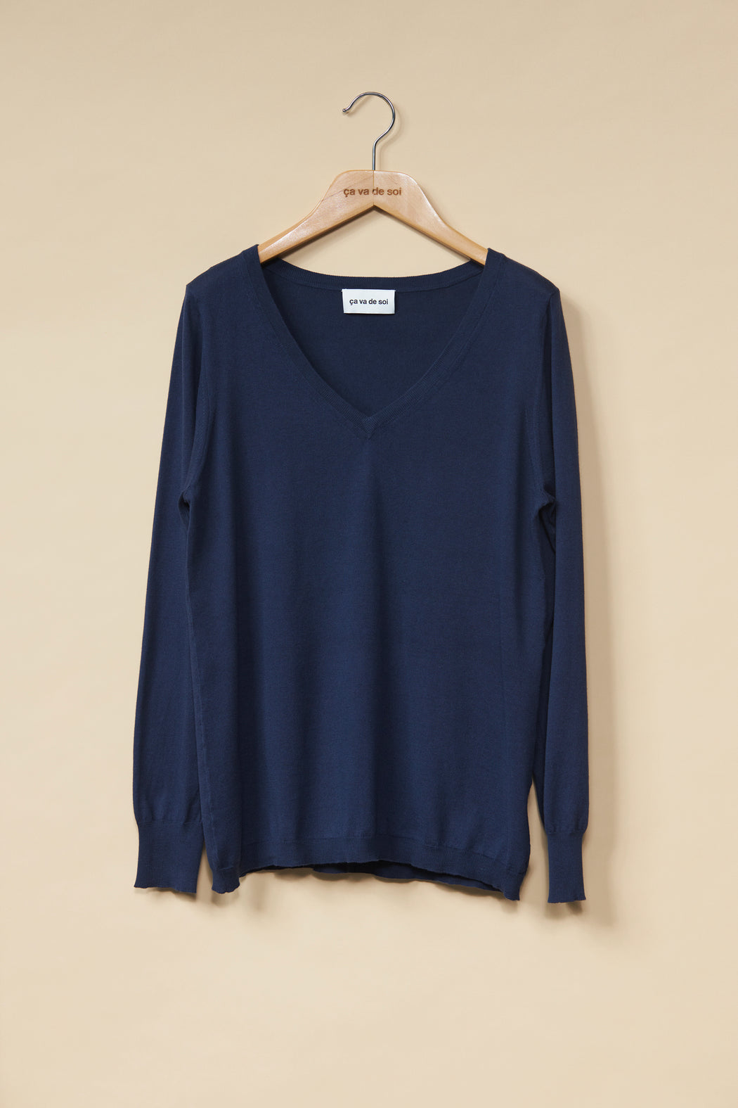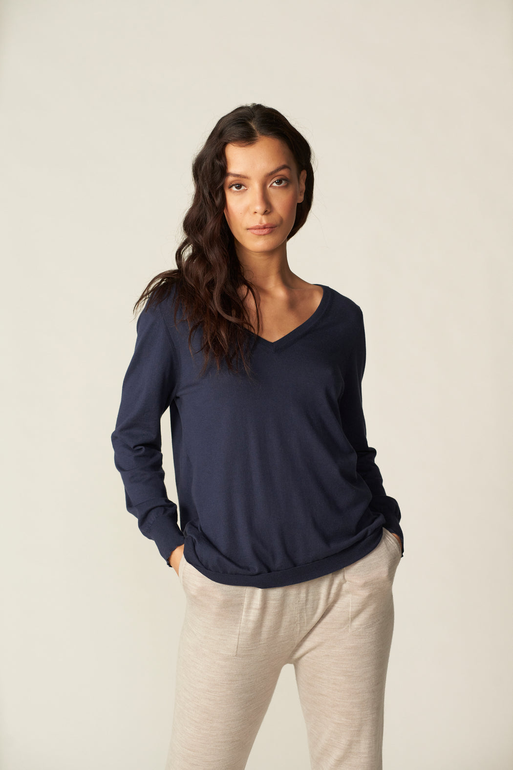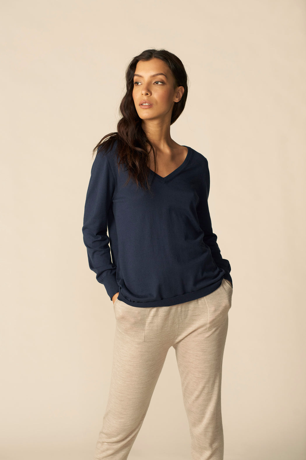 This flowy v-neck pullover is made with Egyptian Nilo cotton: the first ELS - extra long staple - organic cotton, the hybrid of two exceptional seed varieties of cotton Giza 45 and Giza 87. The balmy effect of this cotton on the skin is pure joy. Its fluidity give it a nonchalant allure, comfortable while sophisticated. We produced this fine knit in four essential colors hank dyed by Italian masters.