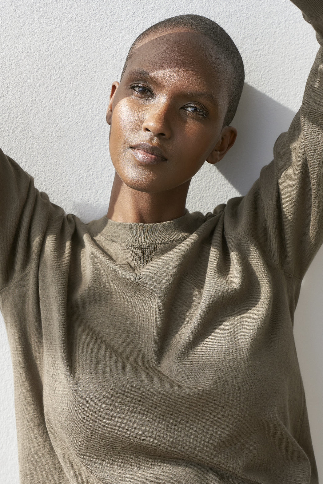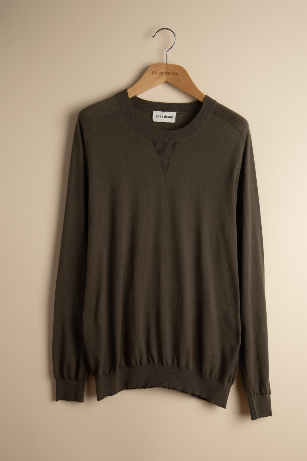 It's not just any round-neck sweater... With its saddle shoulder armhole, its slightly bubble shape, and the 'baseball' detail on the front, it brings a couture spirit to the great sports classic by Benjamin Russel Jr. We make it more formal with a pencil skirt or more relaxed with a pair of jeans that have become as cozy as him.